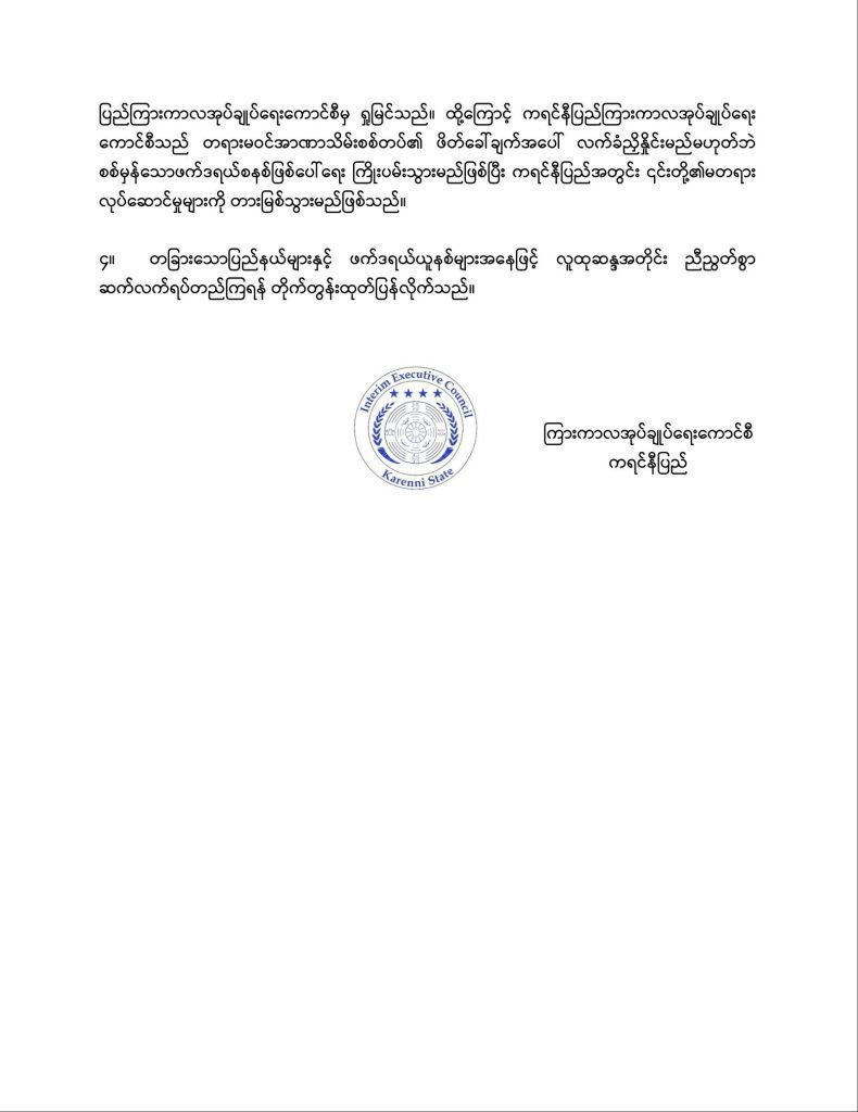 ဒါ့ကြောင့် ကြားကာလကရင်နီပြည် အုပ်ချုပ်ရေးကောင်စီက စစ်ကောင်စီရဲ့ ကမ်းလှမ်းမှုကို လုံး၀လက်မခံဘဲ အဆုံးတိုင် ဖက်ဒရယ် ရရှိရေးအတွက် ကြိုးပမ်းသွားမှာဖြစ်ပြီး ကရင်နီဒေသအတွင်း စစ်ကောင်စီရဲ့ မတရားလုပ်ရပ်တွေကိုလည်း တိုက်ဖျက်သွားမယ်လို့ ဆိုပါတယ်။