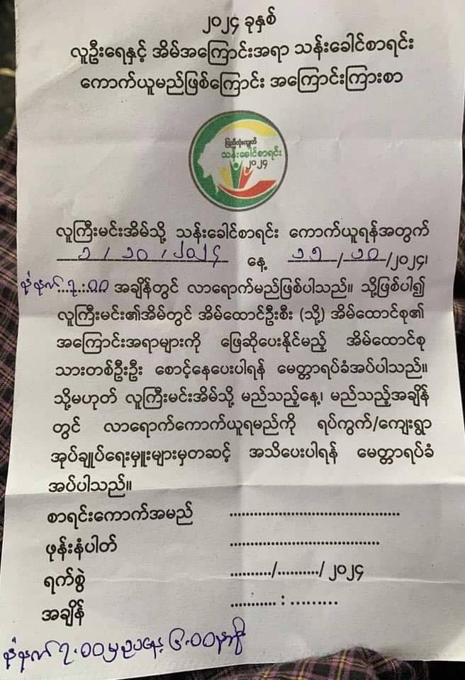 အာဏာသိမ်းစစ်ကောင်စီဟာ သူတို့ရဲ့ တရားမဝင် ရွေးကောက်ပွဲကို လာမယ့်နှစ်မှာ ကျင်းပဖို့အတွက် သန်းခေါင်စာရင်းကောက်ယူရေးကို လုပ်ဆောင်နေတာဖြစ်ပါတယ်။ တော်လှန်ရေးအင်အားစုတွေဘက်ကတော့ စစ်ကောင်စီရဲ့ ရွေးကောက်ပွဲကို အသိအမှတ် မပြုသလို သန်းခေါင်စာရင်းကောက်ယူမှုအပါအဝင် ရွေးကောက်ပွဲဖြစ်မြောက်ရေး ကူညီလုပ်ဆောင်သူတွေကို ပြင်းပြင်းထန်ထန် အရေးယူသွားမယ်လို့ သတိပေးထားပါတယ်။