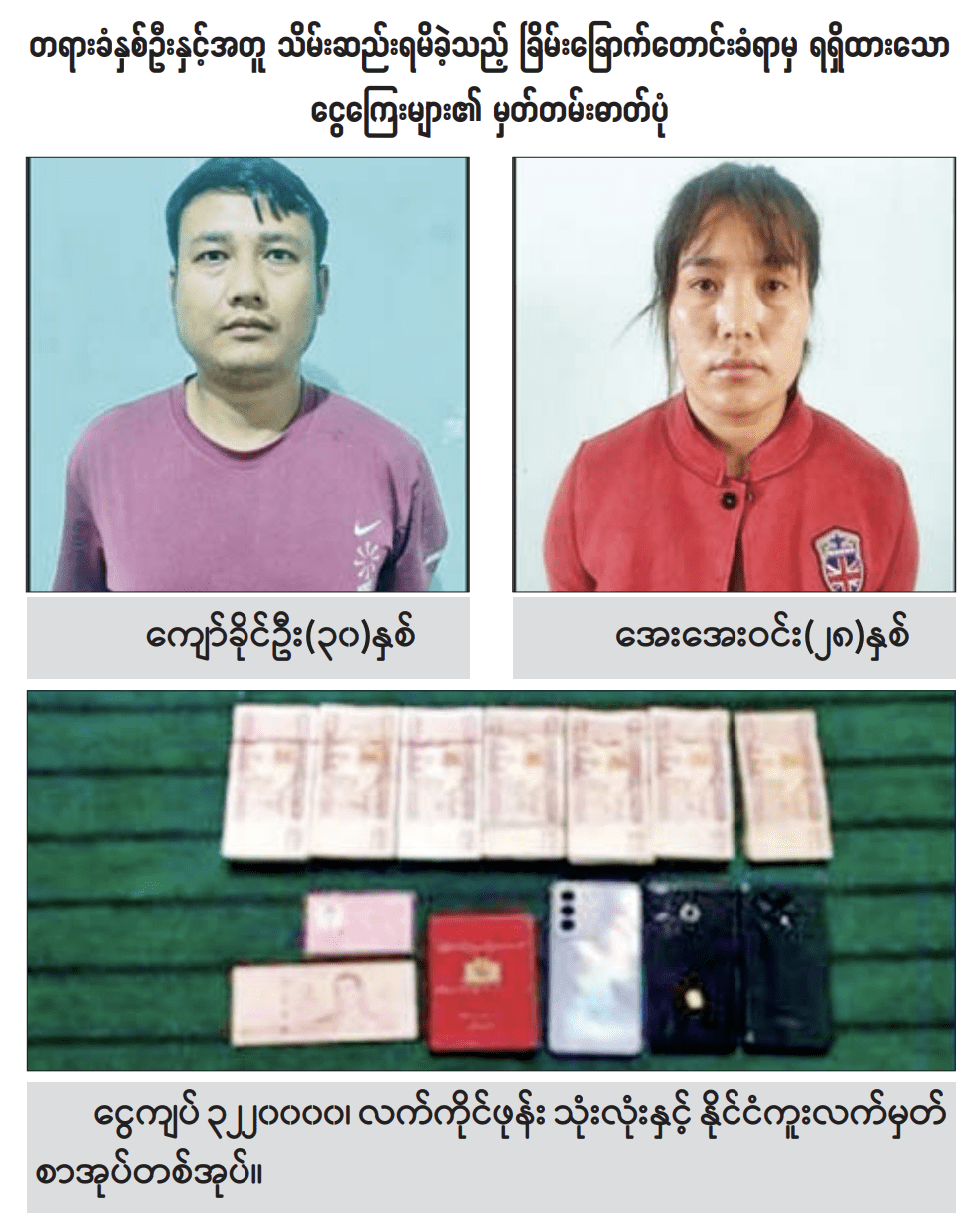 ခြိမ်းခြောက်ငွေတောင်းခံနေသူတွေဖြစ်တဲ့ ကျော်ခိုင်ဦး နဲ့ သူ့ရဲ့ တရားမဝင်ဇနီးဖြစ်သူ အေးအေးဝင်းတို့ ဟာ ပြင်ဦးလွင်မြို့နယ်၊ မိုးကြိုးပစ်ကျေးရွာ၊ ခေတ္တာလမ်း၊ အမှတ်(၂၂၆)တွင်ရောက်ရှိနေကြောင်း သတင်းရလို့ စစ်ကောင်စီတပ်တွေက သွားရောက်ဖမ်းဆီးခဲ့တာဖြစ်ပြီးဘသူတို့နှစ်ယောက်ဟာ Myanmar Business Directory Application အသုံးပြုကာ စီးပွားရေးလုပ်ငန်းရှင်တွေရဲ့ ဖုန်းနံပါတ်တွေကို ရှာဖွေပြီး ငွေကျပ် သိန်း ၂၂၀၀ ကျော်တောင်းခံခဲ့တာဖြစ်တယ်လို့ သိရပါတယ်။