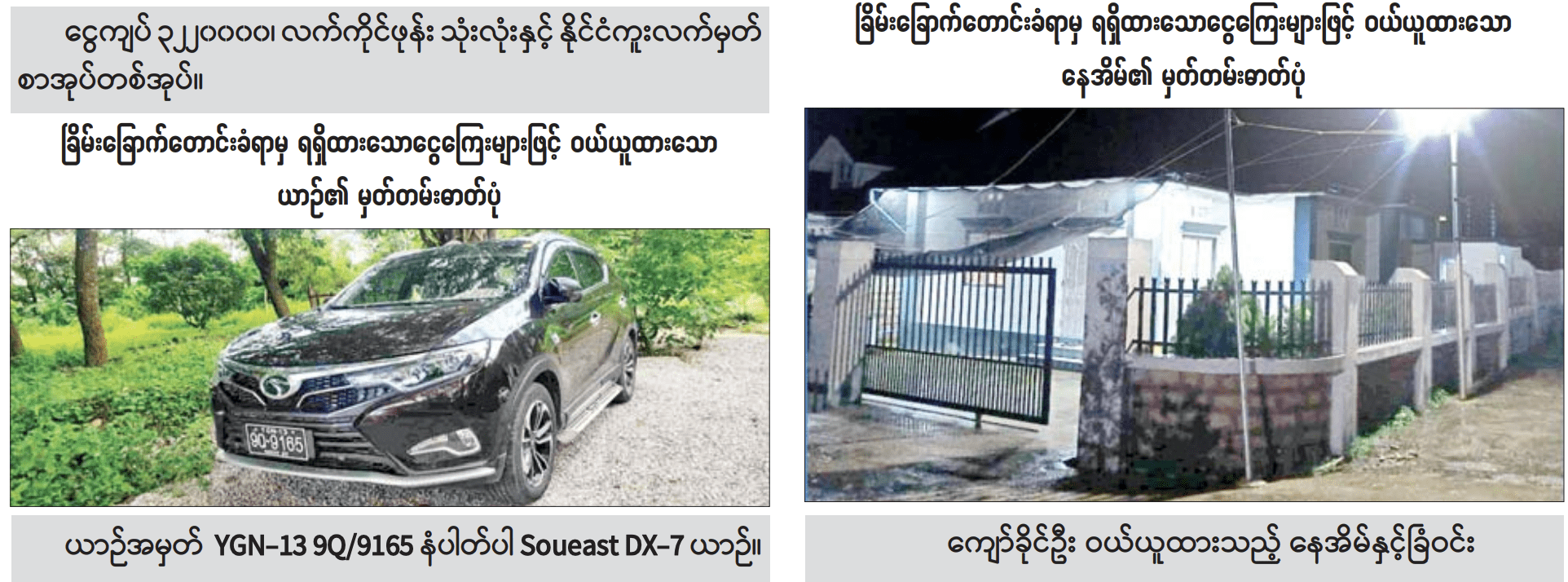 ခြိမ်းခြောက်ငွေတောင်းသူ နှစ်ယောက်ဟာ တောင်းခံလို့ရတဲ့ ငွေတွေကို ငွေကျပ်သိန်း (၄၀၀)တန် Soueast အမျိုးအစားကားတစ်စီးနဲ့မိုးကြိုးပစ်ကျေးရွာမှာငွေကျပ်သိန်း၁၄၀၀တန်နေအိမ်တစ်လုံးဝယ်ယူခဲ့တယ်လို့သိရပါတယ်။