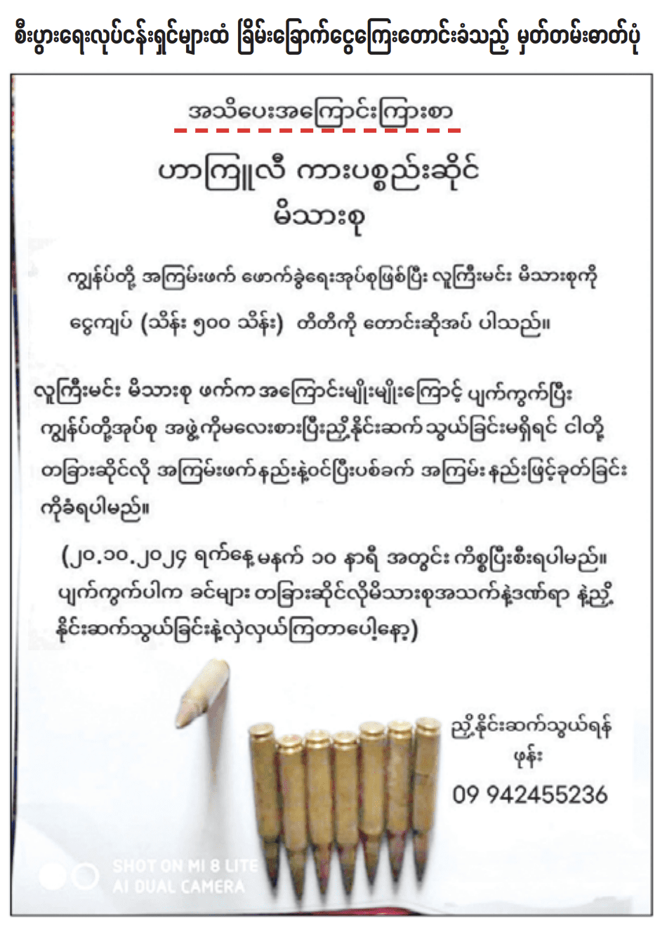 စစ်ကောင်စီ တယ်လီဂရမ်ချန်နယ်တွေမှာ တော်လှန်ရေးအဖွဲ့တွေရဲ့ ခြိမ်းခြောက်စာ ဆိုပြီး ဟာကြူလီကားပစ္စည်းအရောင်းဆိုင်ကို လိမ်မူပေးပို့တဲ့ခြမ်းခြောက်စာဟာလည်း သူတို့ရဲ့ ခြိမ်းခြောက်ငွေတောင်းခံမှုဖြစ်တယ်လို့ စစ်ကောင်စီက ဆိုပါတယ်။