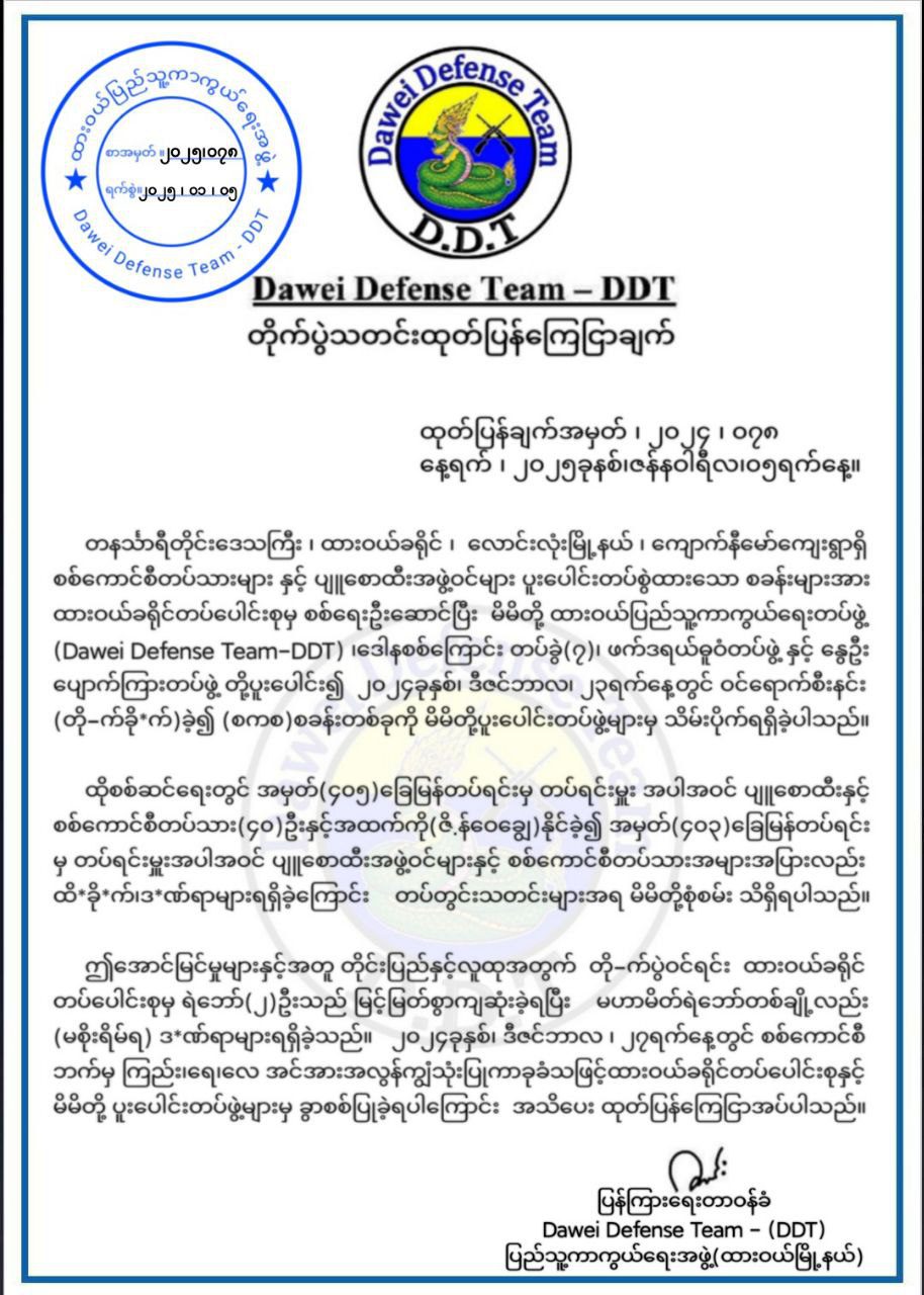 တနင်္သာရီတိုင်း၊ လောင်းလုံမြို့နယ်၊ ကျောက်နီမော် ကျေးရွာက စစ်ကောင်စီစခန်းသိမ်းတိုက်ပွဲအတွင်း စစ်ကောင်စီတပ်သား ၄၀ ထက်မနည်း သေဆုံးခဲ့ကြောင်း ထားဝယ်ခရိုင်တပ်ပေါင်းစုက အသိပေးထုတ်ပြန်ပါတယ်။
