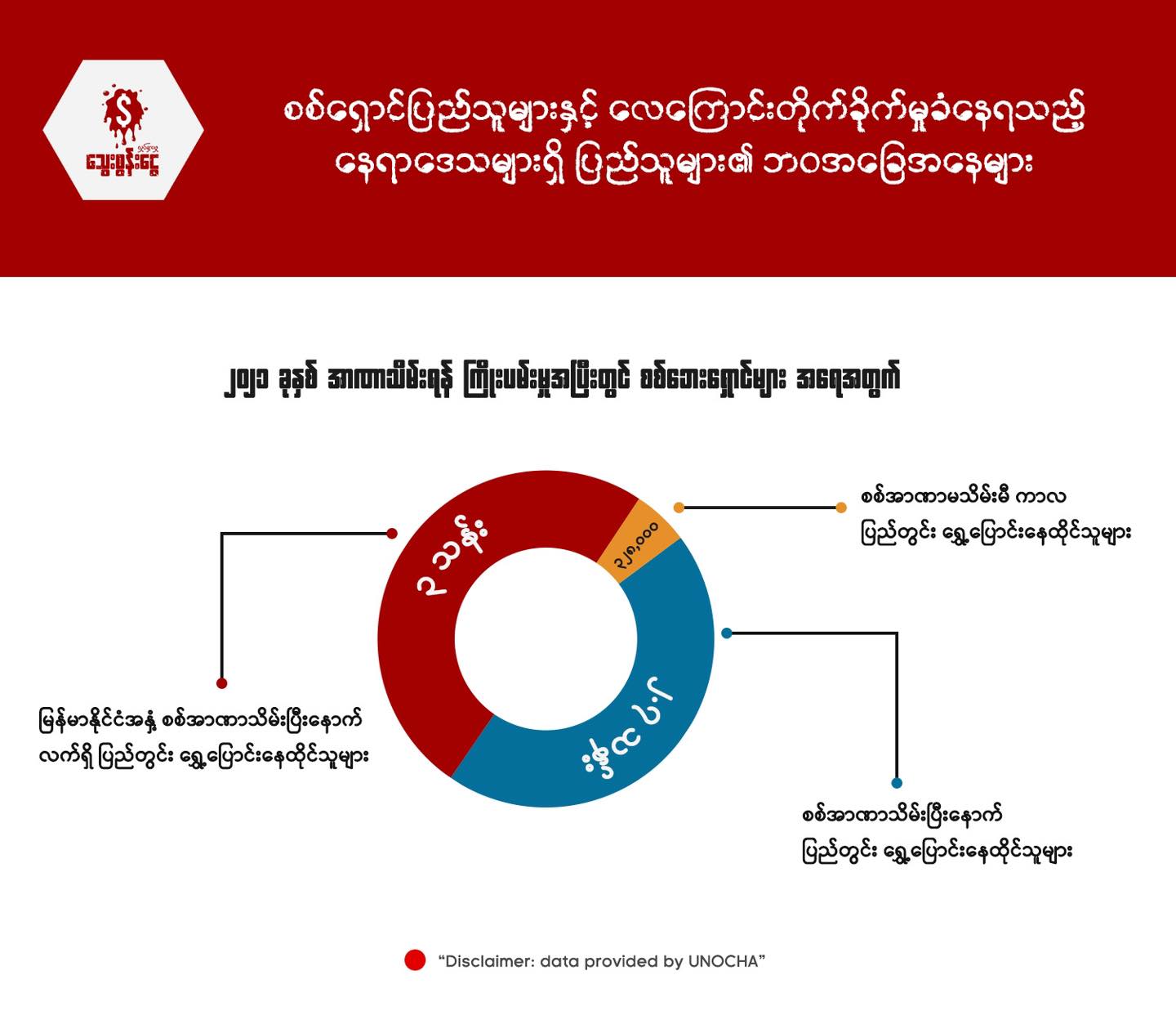 ၂၀၂၁ ခုနှစ်နောက်ပိုင်း မြန်မာနိုင်ငံ တွင် စစ်ဘေးရှောင်ဦးရေ မြင့်တက်လျက် ရှိပြီး မြန်မာပြည်ရဲ့ အနောက်မြောက်ပိုင်းတွင် စစ်ဘေး ရှောင်ဦးရေ ၉၇၀ç၀၀၀ ကျော်ဖြင့် အမြင့်ဆုံး ဖြစ်ခဲ့ကြောင်း ကုလသမဂ္ဂလူသားချင်းစာနာမှု ဆိုင်ရာညှိနှိုင်းရေးရုံး (OCHA Myanmar)က ထုတ်ပြန်ထားပါတယ်။
