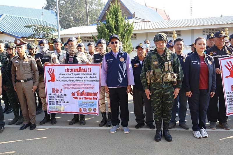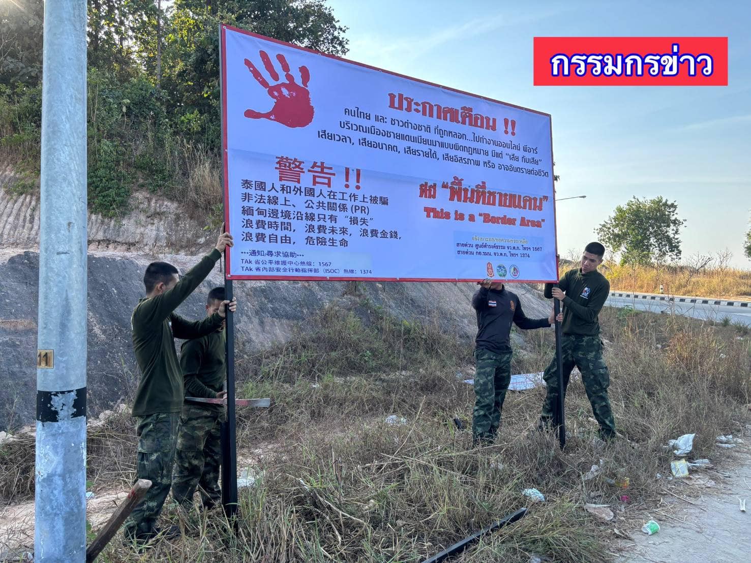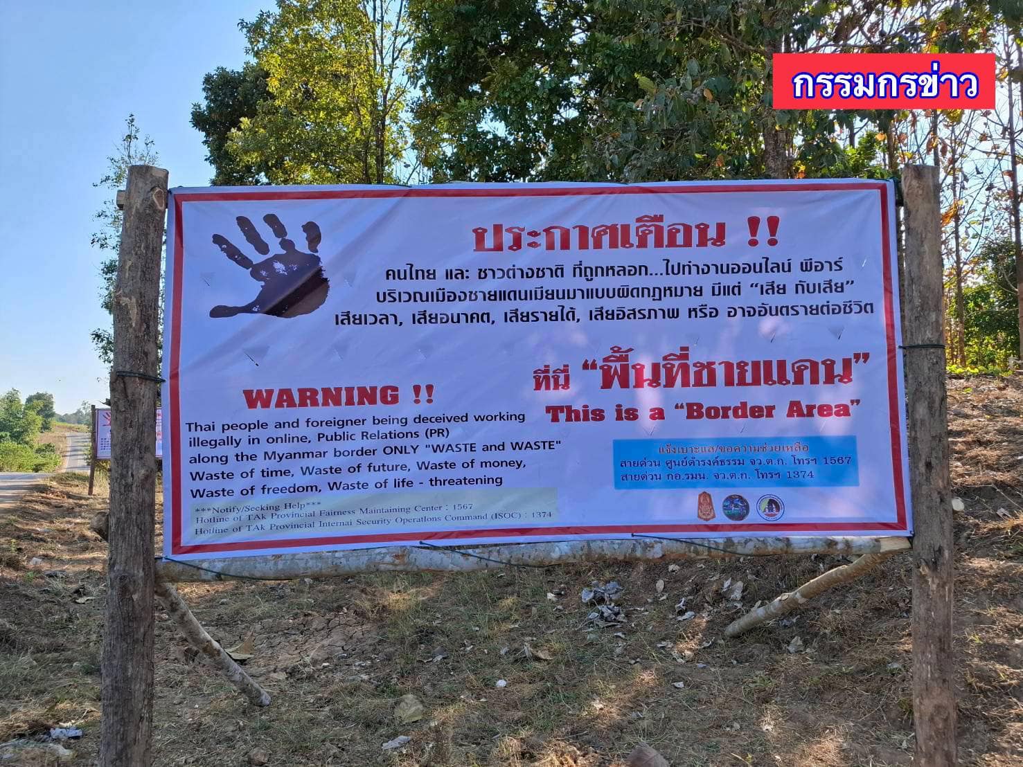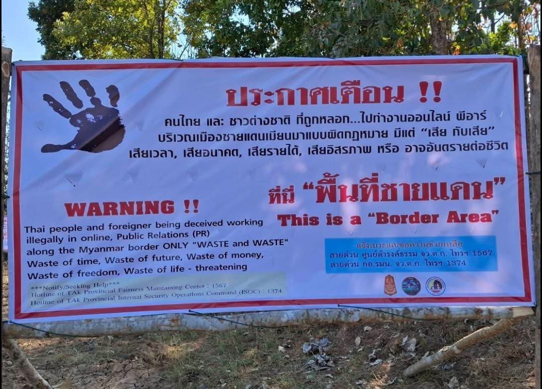 ထိုင်းနိုင်ငံ၊ တာ့ခ်ခရိုင်၊ မဲဆောက်မြို့နယ်မှာ ကျားဖြန့်အွန်လိုင်းငွေလိမ်ဂိုဏ်းတွေရဲ့ လိမ်လည်မှု မခံရစေဖို့အတွက် အသိပညာပေးဆိုင်းဘုတ်တွေ လိုက်ထောင်နေတယ်လို့ သိရပါတယ်။