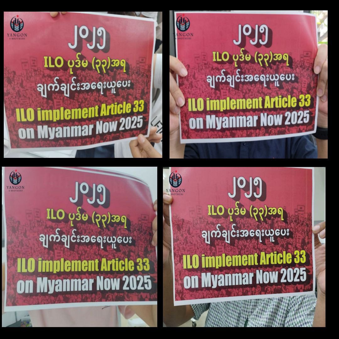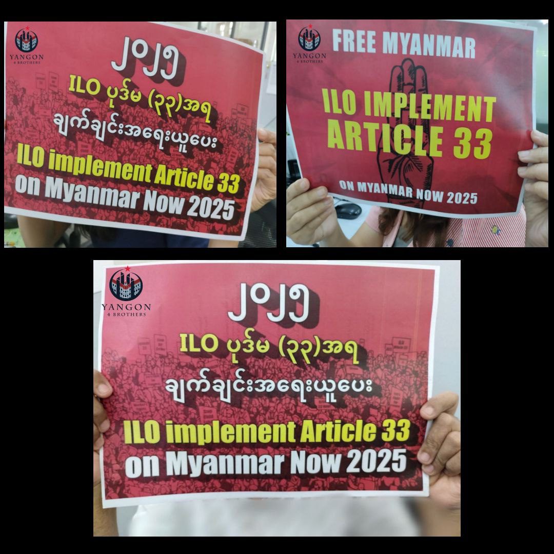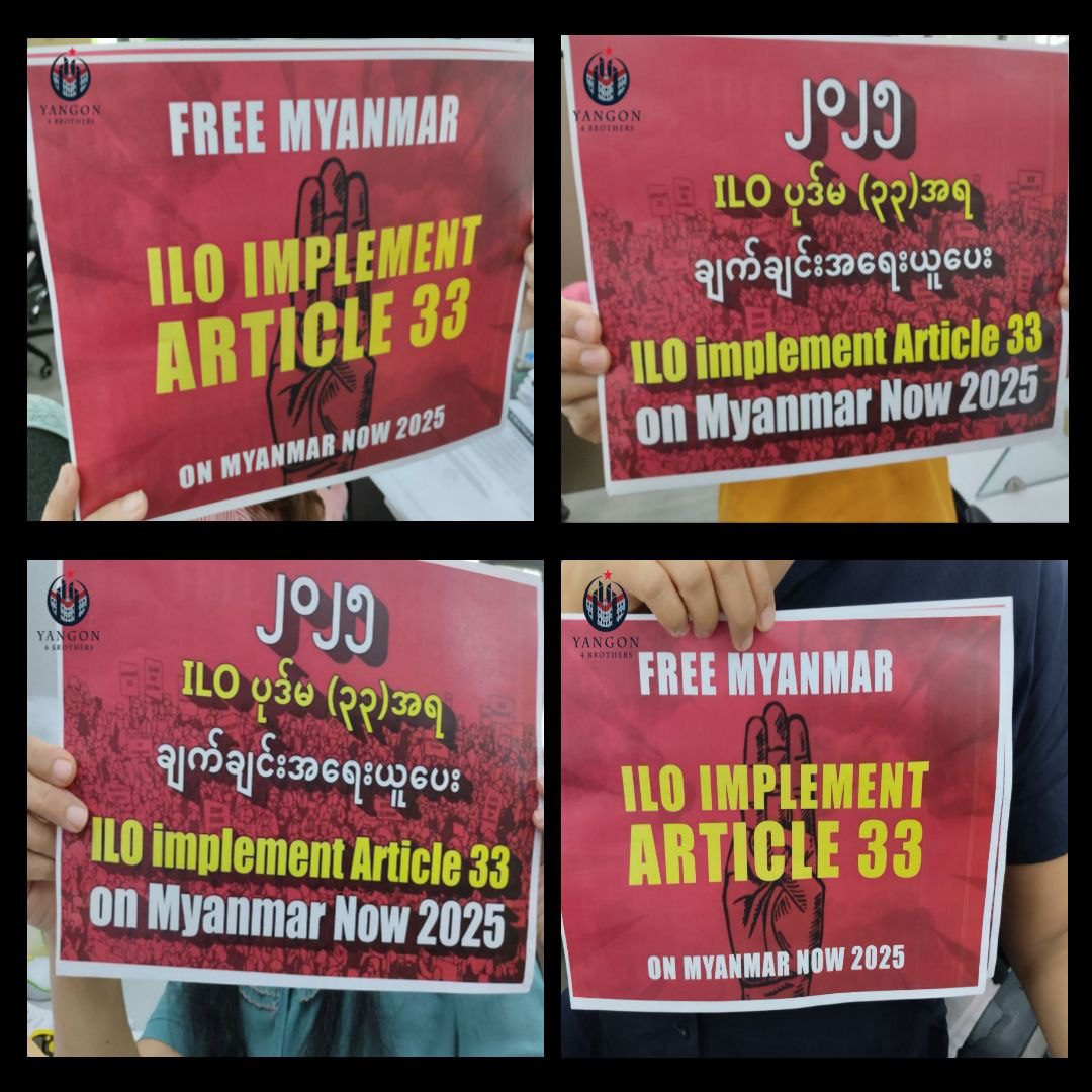 “၂၀၂၅ ILO ပုဒ်မ (၃၃)အရ ချက်ချင်း အရေးယူပေး ILO implement Article 33 on Myanmar Now 2025” ပိုစတာတွေနဲ့အတူ တောင်းဆိုလှုပ်ရှားမှုကို ပြုလုပ်ခဲ့တာပါ။