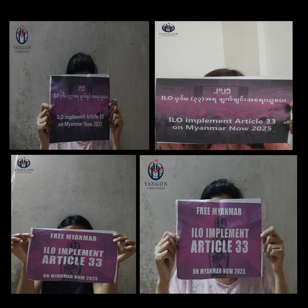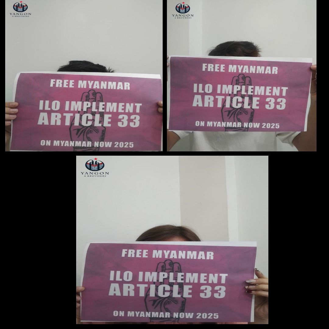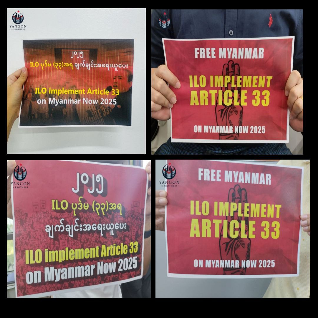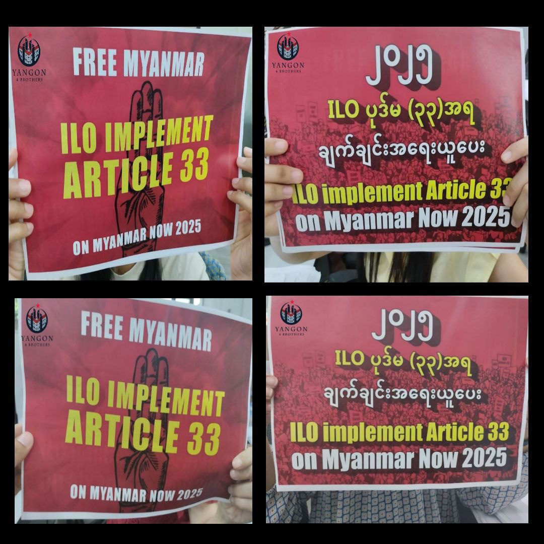 “၂၀၂၅ ILO ပုဒ်မ (၃၃)အရ ချက်ချင်း အရေးယူပေး ILO implement Article 33 on Myanmar Now 2025” ပိုစတာတွေနဲ့အတူ တောင်းဆိုလှုပ်ရှားမှုကို ပြုလုပ်ခဲ့တာပါ။