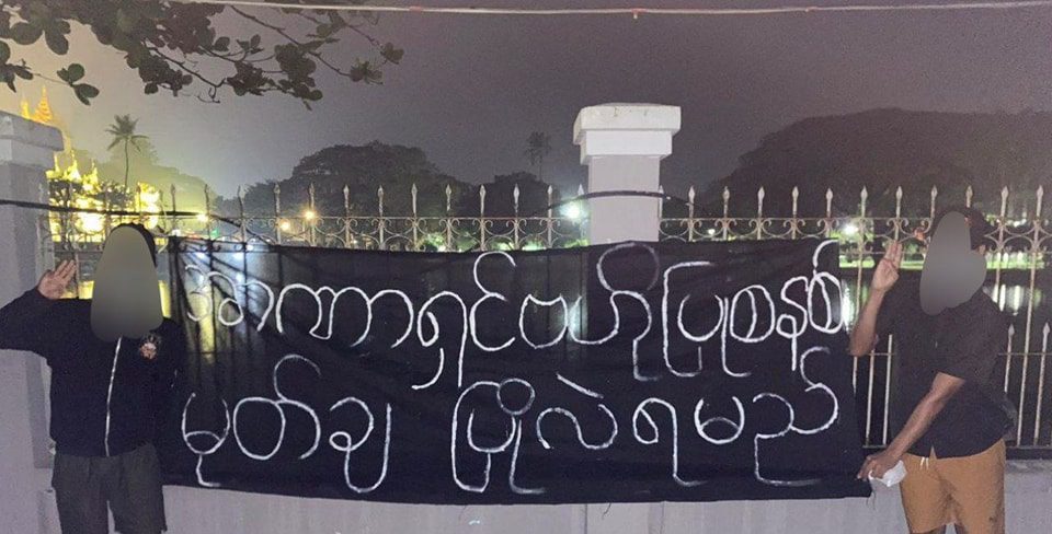 ရန်ကုန်မြို့လယ်ခေါင်မှာ မတ်လ ၂၇ ရက် ဒီနေ့မှာ ကျရောက်တဲ့ နှစ် ၈၀ ပြည့် ဖက်ဆစ်တော်လှန်ရေးနေ့ အထိမ်းအမှတ်အဖြစ် “အာဏာရှင် ဗဟိုပြုစနစ် မုချပြိုလဲရမည်” ဆို စာသားပါ ဗီနိုင်းကို ချိတ်ဆွဲပြီး စစ်အာဏာရှင်ဆန့်ကျင်ရေးလှုပ်ရှားမှု ပြုလုပ်ခဲ့တယ်လို့ Youth of Anarchy – YOA ဆီက သိရပါတယ်။