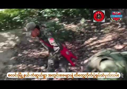 Read More 1 minute read VVideos ရေစကြိုမှာ သန်းခေါင်စာရင်းကောက်ဖို့လာတဲ့ အကြမ်းဖက်စစ်သားတွေ အနီးကပ်ချုံခိုတိုက်ခိုက်ခံရပြီး ၁ ယောက်သေ၊ ၅ ယောက်ဒဏ်ရာရ (ရုပ်/သံ)November 11, 2024 မကွေးတိုင်း၊ ရေစကြိုမြို့နယ် အမှတ် (၇) ၅၀၀ ရပ်ကွက်အတွင်း သန်းခေါင်စာရင်းကောက်ဖို့လာတဲ့ အင်အား ၅၀ ခန့်ရှိ အကြမ်းဖက်စစ်သားတွေကို နိုဝင်ဘာ ၁၀ ရက် မနေ့က နေ့လယ်ပိုင်းမှာ တော်လှန်ရေးတပ်တွေ အနီးကပ်ချုံခိုတိုက်ခိုက်ခဲ့တယ်လို့ ပြည်သူ့ကာကွယ်ရေးတပ်ဖွဲ့- ရေစကြိုမြို့နယ်ထံက သိရပါတယ်။