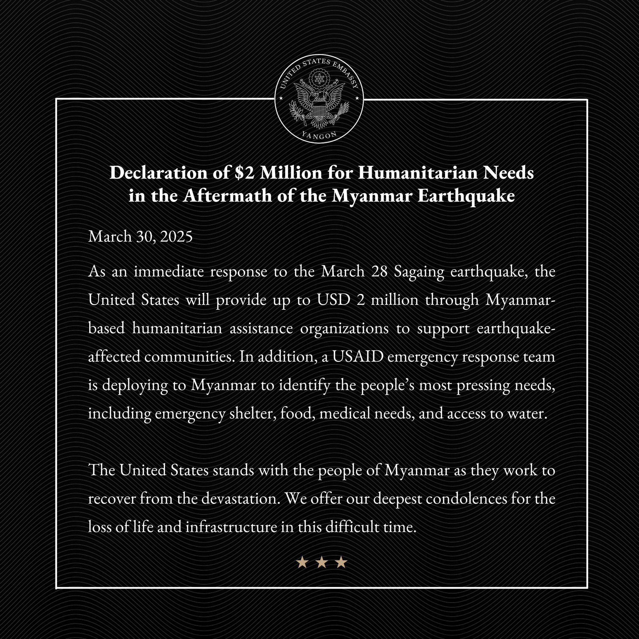 ပြင်းထန်တဲ့ ငလျင်ဘေးဒဏ်သင့် မြန်မာနိုင်ငံအတွက် အမေရိကန်အစိုးရက ဒေါ်လာ ၂ သန်းထောက်ပံ့ကူညီသွားမယ်လို့ ဒီနေ့ ထုတ်ပြန်ပါတယ်။