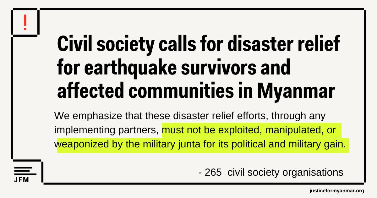 ငလျင်ကြောင့် ထိခိုက်ပျက်စီးဆုံးရှုံးနစ်နာခဲ့တဲ့ ပြည်သူတွေထံ ကူညီကယ်ဆယ်ရေး လုပ်ဆောင်ရမှာ စစ်ကောင်စီက နိုင်ငံရေးနဲ့ စစ်ရေးအရ အမြတ်မထုတ်နိုင်အောင် သေချာစွာ လုပ်ဆောင်ပေးဖို့ အရပ်ဘက်အဖွဲ့အစည်းတွေ တိုက်တွန်းတောင်းဆိုလိုက်ပါတယ်။