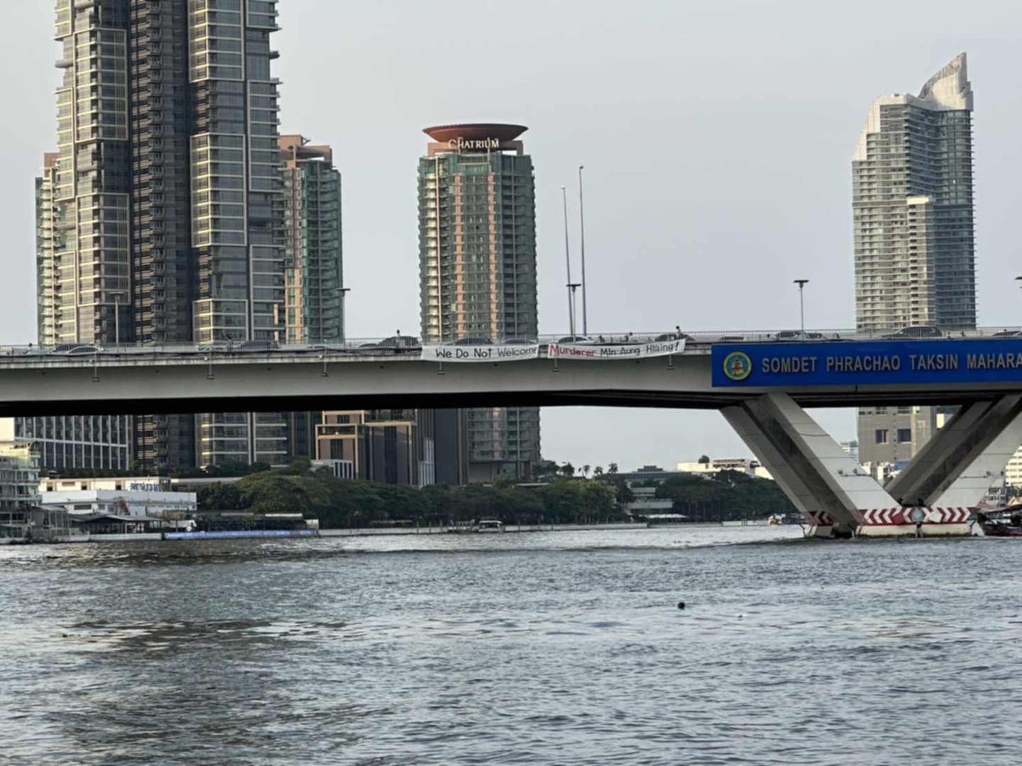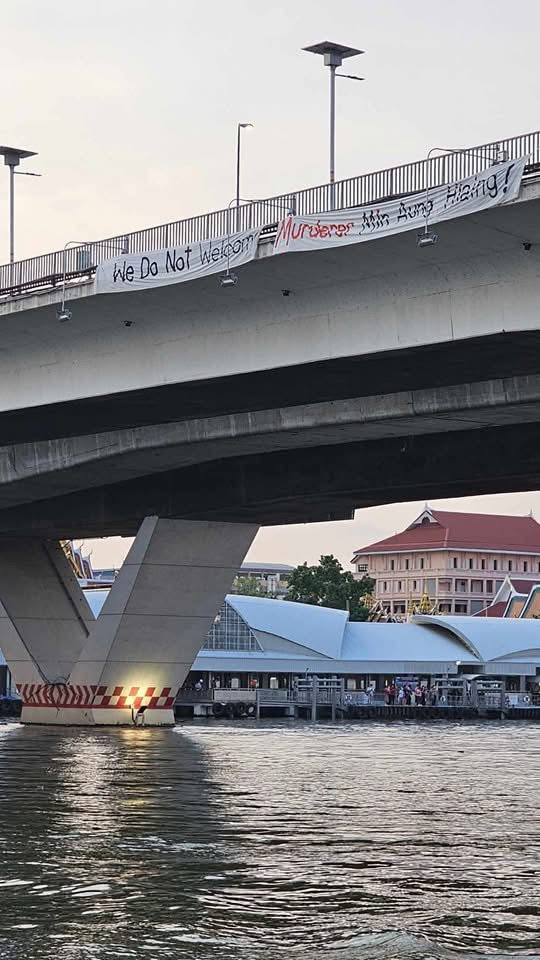 ထိုင်းနိုင်ငံ ဘန်ကောက်မြို့ BIMSTEC အစည်းဝေး ကျင်းပမယ့် ရှန်ဂီလာဟိုတယ်အနီးမှာ We Do Not Welcome Murderer Min Aung Hlaing (လူသတ်သမားမင်းအောင်လှိုင်ကို ငါတို့မကြိုဆိုဘူး) စာတမ်းချိတ်ဆွဲပြီး ဆန္ဒပြထားကြောင်း သိရပါတယ်။