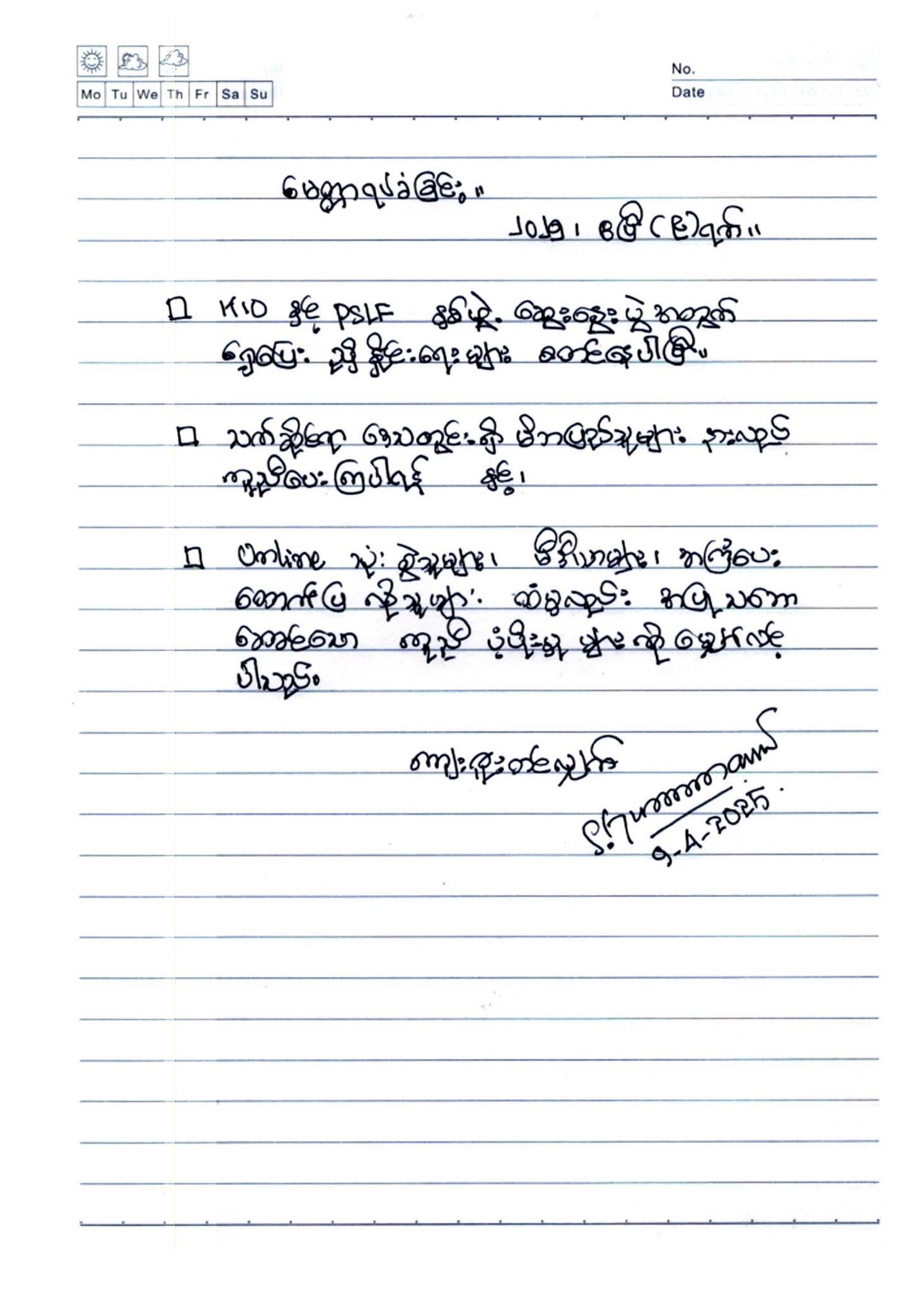 “KIO နှင့် PSLF နှစ်ဖွဲ့ဆွေးနွေးပွဲအတွက် ရှေ့ပြေးညှိနှိုင်းရေးများစတင်နေပါပြီ၊ သက်ဆိုင်ရာ ဒေသတွင်းရှိ မိဘပြည်သူများ နားလည်ကူညီပေးကြပါရန် နှင့် Online သုံးစွဲသူများ၊ မီဒီယာများ၊ အကြံပေးထောက်ပြလိုသူများထံမှလည်း အပြုသဘောဆောင်သော ကူညီပံ့ပိုးမှုများကို မျှော်လင့်ပါသည် “ လို့ ဒုတိယဗိုလ်ချုပ်ကြီး ဂွမ်မော်က အသိပေးရေးသားထားပါတယ်။