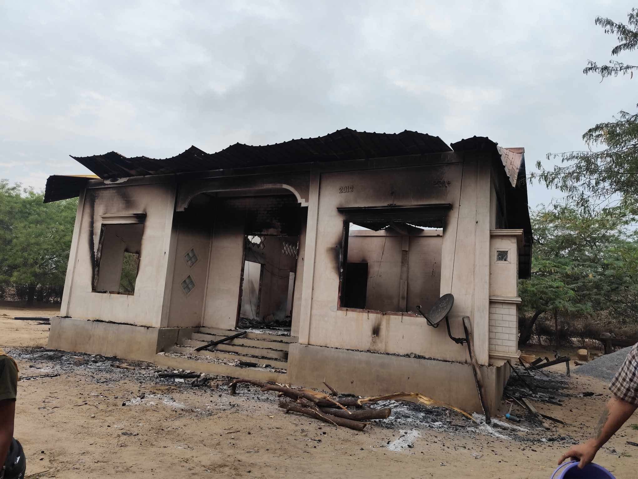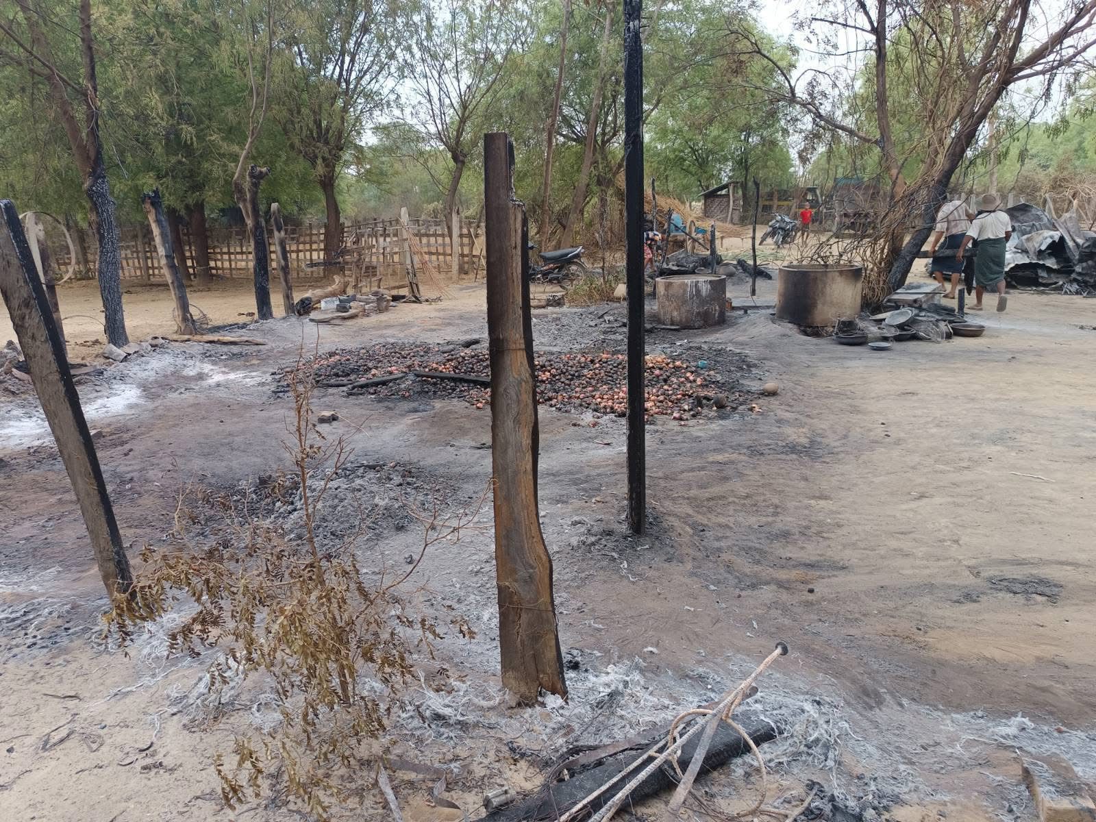 စစ်ကောင်စီတပ် မီးဝင်ရှို့ခဲ့သည့် စံတင်ကင်းရွာမြင်ကွင်း (ဓာတ်ပုံ မြင်းမူမြို့နယ် သတင်းမှန်ပြန်ကြားရေး)