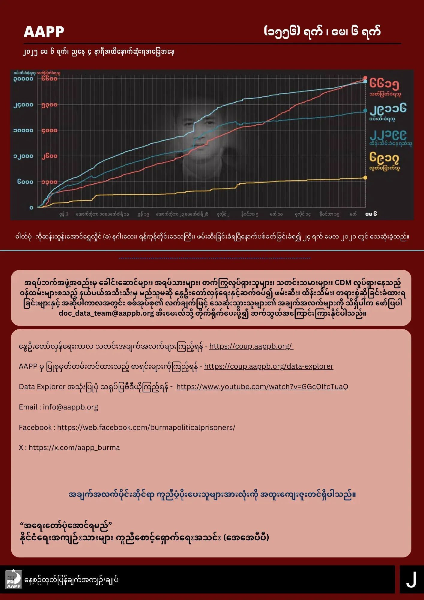အကြမ်းဖက်စစ်အုပ်စု မတရားအာဏာသိမ်းခဲ့တဲ့ ၂၀၂၁ ခုနှစ်၊ ဖေဖော်ဝါရီလ ၁ ရက်ကစလို့ မေလ ၆ ရက် ဒီနေ့အချိန်အထိ နွေဦးတော်လှန်ရေးကာလအတွင်း အကြမ်းဖက်စစ်အုပ်စုနဲ့ လက်ပါးစေတွေကြောင့် သေဆုံးခဲ့တဲ့ ဒီမိုကရေစီရေး လှုပ်ရှားသူတွေနဲ့ အရပ်သားပြည်သူ စုစုပေါင်း (၆၆၁၅) ယောက် ရှိပြီဖြစ်တယ်လို့ AAPP က ထုတ်ပြန်ထားပါတယ်။
