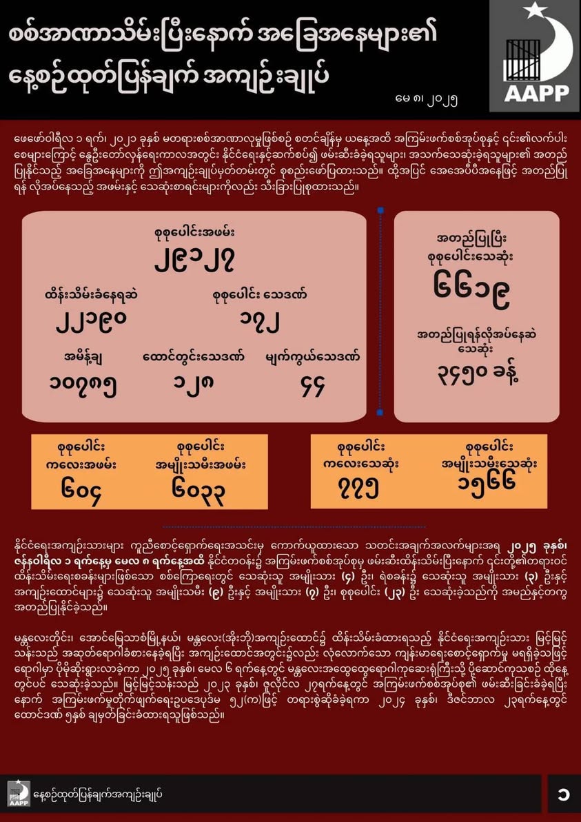 ၂၀၂၅ ခုနှစ်၊ ဇန်နဝါရီလ ၁ ရက်ကနေ မေလ ၈ ရက်အထိ နိုင်ငံတစ်ဝန်း အကြမ်းဖက်စစ်အုပ်စု ဖမ်းဆီးထိန်းသိမ်းပြီးနောက် စစ်ကောင်စီရဲ့ တရားဝင်ထိန်းသိမ်းရေးစခန်းတွေဖြစ်တဲ့ စစ်ကြောရေးစခန်းမှာ သေဆုံးသူ အမျိုးသား (၄) ယောက်၊ ရဲစခန်းမှာ သေဆုံးသူ အမျိုးသား (၃) ယောက်၊ အကျဉ်းထောင်တွေမှာ သေဆုံးသူ အမျိုးသမီး (၉) ယောက်နဲ့ အမျိုးသား (၇) ယောက် စုစုပေါင်း (၂၃) ယောက် သေဆုံးခဲ့တာကို နာမည်နဲ့တကွ အတည်ပြုနိုင်ခဲ့တယ်လို့ AAPP က ဆိုပါတယ်။