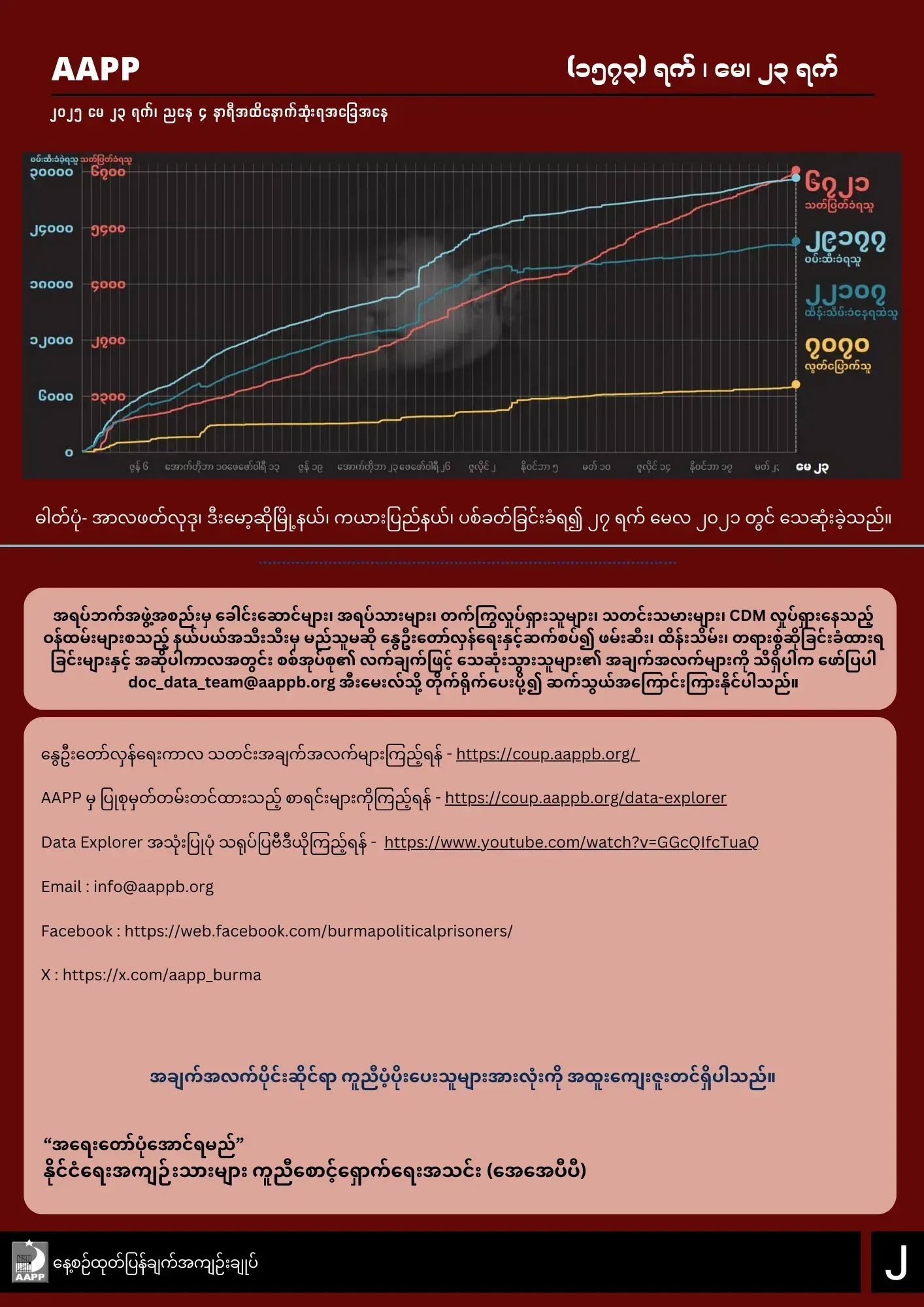 ၂၀၂၁ ခုနှစ် မတရားစစ်အာဏာလုချိန်ကစလို့ မေလ ၂၃ ရက် ဒီနေ့အထိ နွေဦးတော်လှန်ရေးကာလအတွင်း အကြမ်းဖက်စစ်အုပ်စုနဲ့ လက်ပါးစေတွေကြောင့် သေဆုံးခဲ့တဲ့ ဒီမိုကရေစီရေး လှုပ်ရှားသူတွေနဲ့ ပြည်သူစုစုပေါင်း (၆၇၂၁) ယောက် ရှိပြီဖြစ်တယ်လို့ AAPP က ထုတ်ပြန်ထားပါတယ်။