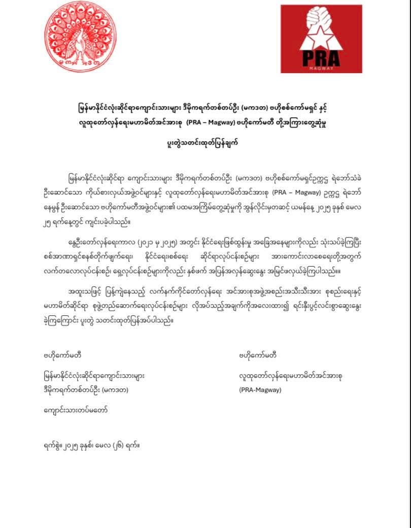 မြန်မာနိုင်ငံလုံးဆိုင်ရာ ကျောင်းသားများ ဒီမိုကရက်တစ်တပ်ဦး (ABSDF) ရဲ့ ဗဟိုစစ်ကော်မရှင် ဥက္ကဋ္ဌ ရဲဘော်သံခဲ ဦးဆောင်တဲ့ ကိုယ်စားလှယ် အဖွဲ့ဝင်တွေနဲ့ လူထုတော်လှန်ရေး မဟာမိတ်အင်အားစု (PRA-Magway) ဥက္ကဋ္ဌ ရဲဘော် နေမွန် ဦးဆောင်တဲ့ ဗဟိုကော်မတီအဖွဲ့ဝင်တို့အကြား ပထမအကြိမ် တွေ့ဆုံမှုကို အွန်လိုင်းကတစ်ဆင့် မေ ၂၅ ရက်မှာ ပြုလုပ်ခဲ့တယ်လို့ အဖွဲ့အစည်း ၂ ခုက ပူးတွဲသတင်းထုတ်ပြန်ထားပါတယ်။