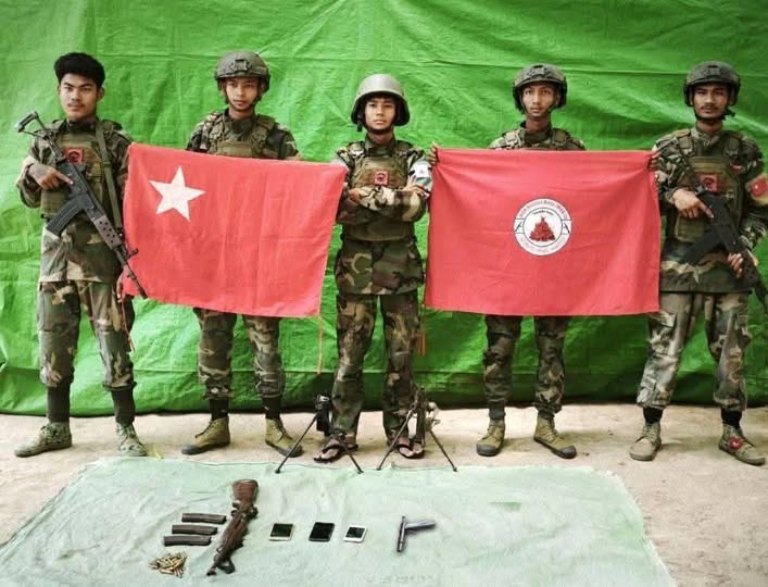 ပုံစာ – မြင်းခြံခရိုင် တပ်ရင်း ၃ တပ်ဖွဲ့ဝင်များအား သိမ်းဆည်းရရှိသည့် ပစ္စည်းများနှင့်အတူ တွေ့ရစဥ်