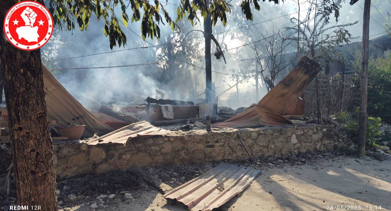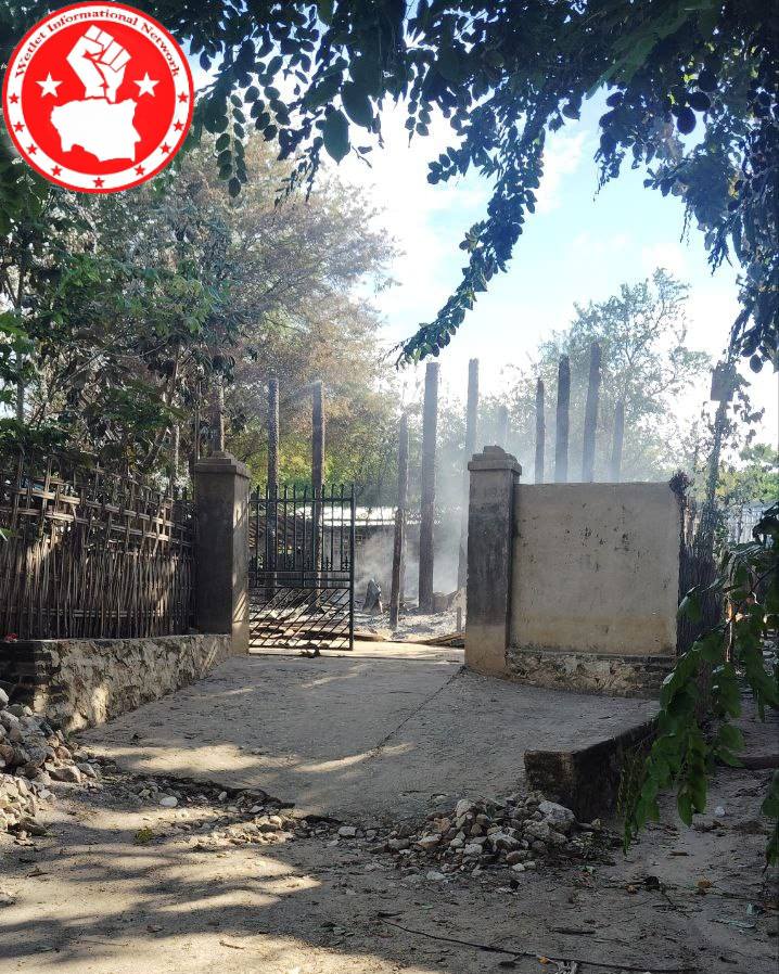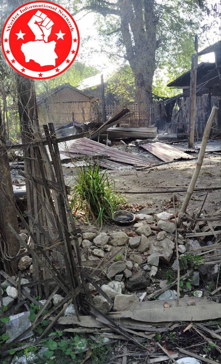 စစ်ကောင်စီတပ်များ မီးရှို့ဖျက်ဆီးခဲ့သည့် ကင်းရွာ မြင်ကွင်း (ဓာတ်ပုံ Wetlet informational Network)