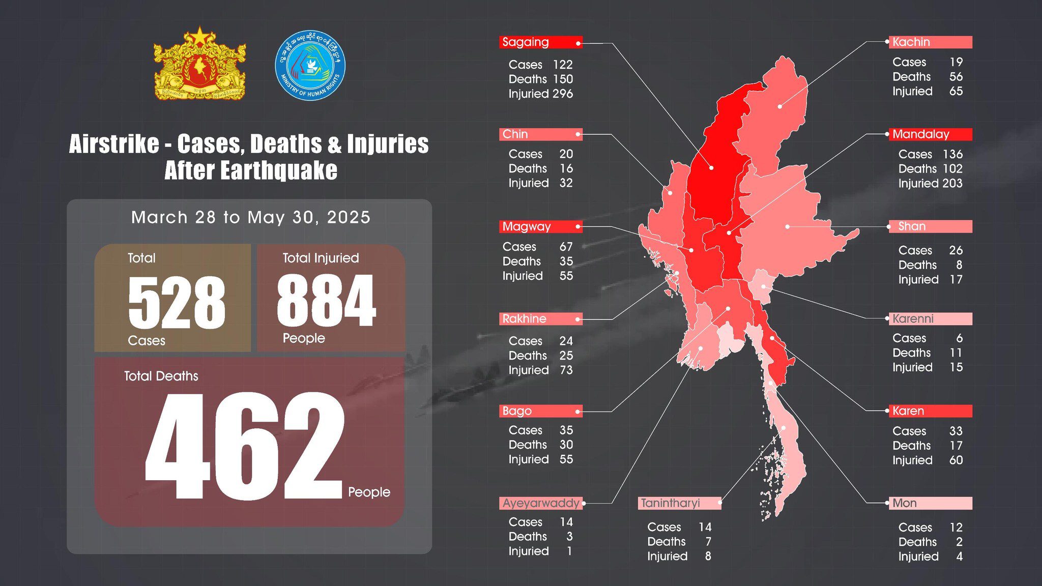 မြန်မာနိုင်ငံမှာ ထောင်နဲ့ချီ သေဆုံးခဲ့ရတဲ့ စစ်ကိုင်းငလျင်ကြီး လှုပ်ခတ်ပြီးနောက် အကြမ်းဖက်စစ်ကောင်စီက နိုင်ငံတစ်ဝန်း လေကြောင်းတိုက်ခိုက်မှု ၅၂၈ ကြိမ် ပြုလုပ်ခဲ့ရာ သေဆုံးသူ ၄၆၂ ယောက်ရှိပြီး ဒဏ်ရာရရှိသူ ၈၈၄ ယောက် ရှိတယ်လို့ အမျိုးသားညီညွတ်ရေးအစိုးရက ဒီနေ့ ထုတ်ပြန်ပါတယ်။