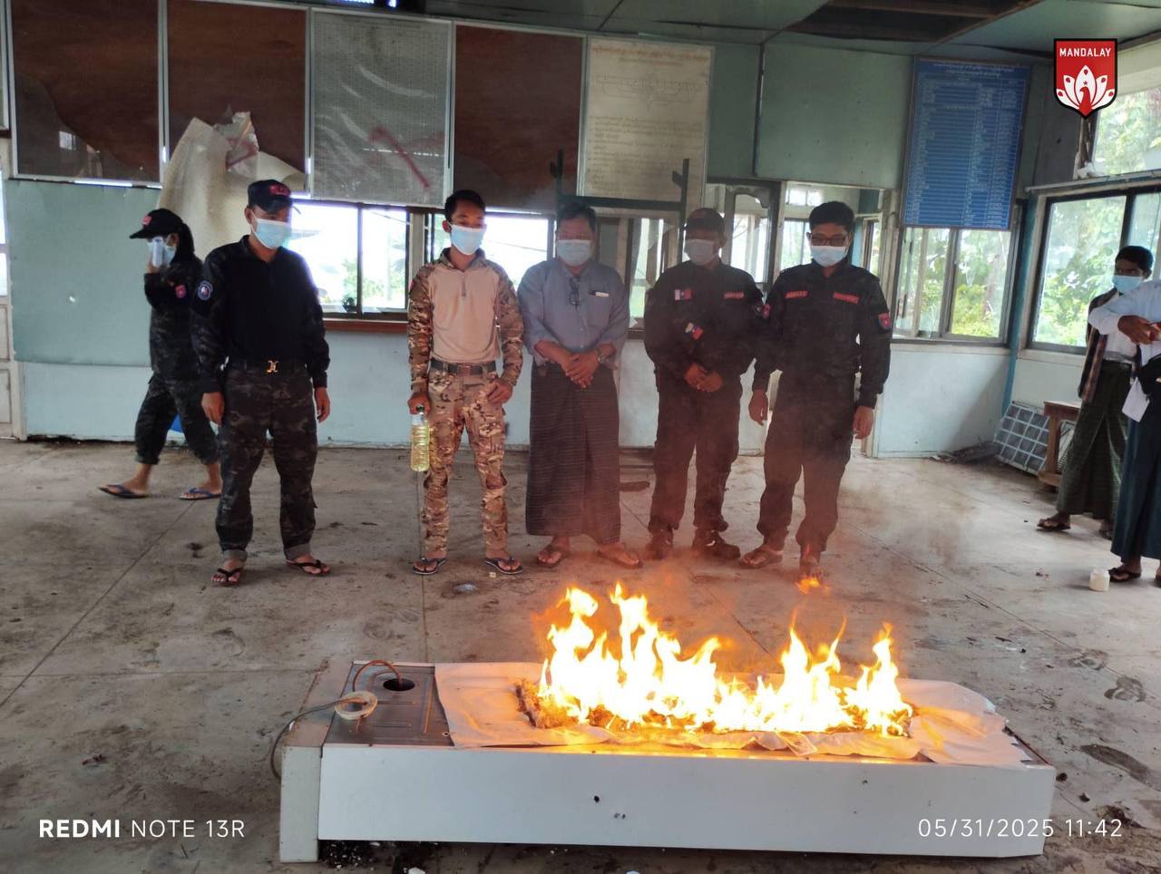 မန္တလေးတိုင်းရှိ စဥ့်ကူးမြို့နယ်နဲ့ သပိတ်ကျင်းမြို့နယ်မှာ ဖမ်းဆီးရမိတဲ့ မူးယစ်ဆေးဝါးတွေကို မီးရှို့ဖျက်ဆီးခဲ့တယ်လို့ ပြည်သူ့ကာကွယ်ရေးတပ်မတော် (မန္တလေး) က ဒီနေ့ ထုတ်ပြန်ပါတယ်။
