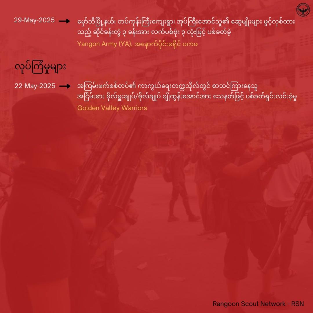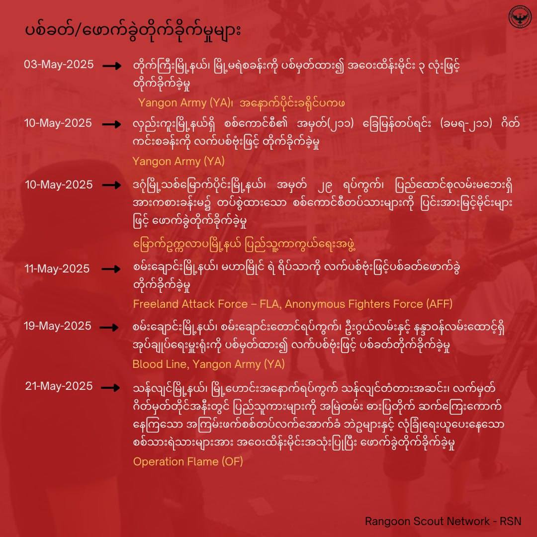 ရန်ကုန်တိုင်းမှာ မေလအတွင်း အငြိမ်းစား ဗိုလ်မှူးချုပ် ချိုထွန်းအောင်ကို လုပ်ကြံရှင်းလင်းမှုအပါအဝင် စစ်ရေးဖော်ဆောင်မှု ၈ ကြိမ် ရှိခဲ့တယ်လို့ Operation Flame အဖွဲ့က ဒီနေ့ ထုတ်ပြန်ပါတယ်။