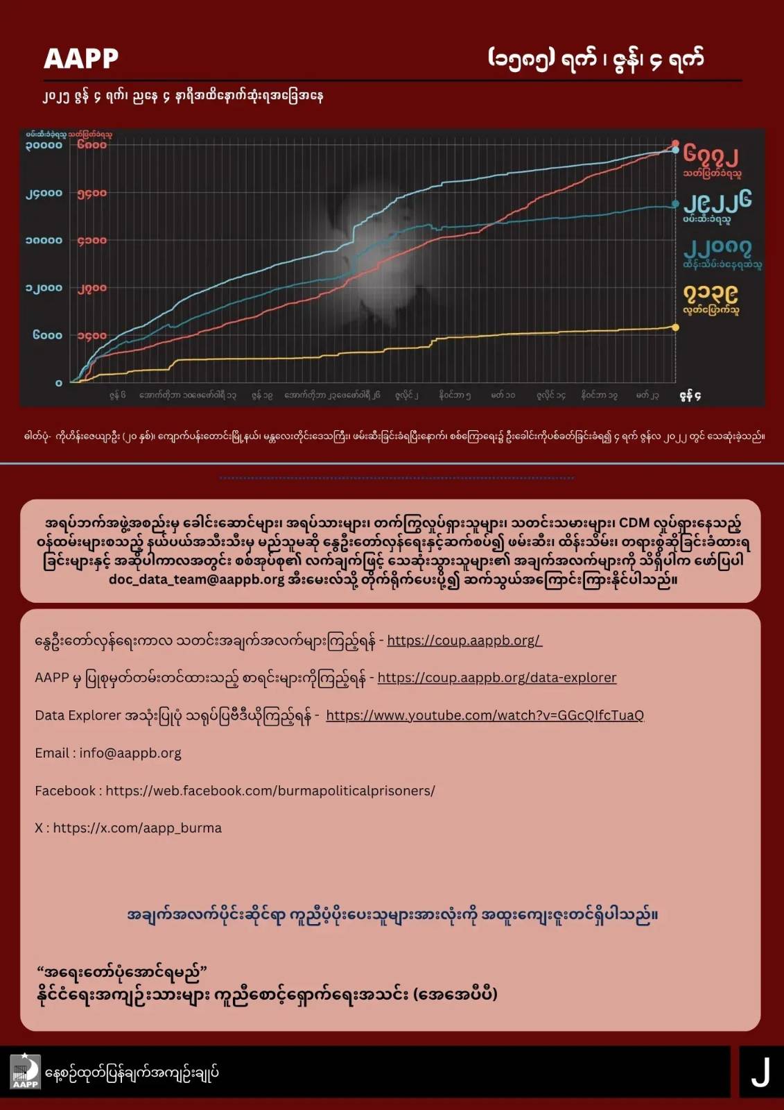 ၂၀၂၁ ခုနှစ် ဖေဖော်ဝါရီလ ၁ ရက် မတရားစစ်အာဏာလုချိန်ကစလို့ ဇွန်လ ၄ ရက် ဒီနေ့အထိ နွေဦးတော်လှန်ရေးကာလအတွင်း အကြမ်းဖက်စစ်အုပ်စုနဲ့ လက်ပါးစေတွေကြောင့် ဒီမိုကရေစီအရေး လှုပ်ရှားသူတွေနဲ့ ပြည်သူတွေ စုစုပေါင်း (၆၇၇၂) ယောက် သေဆုံးခဲ့ရတယ်လို့ AAPP က ထုတ်ပြန်ထားပါတယ်။