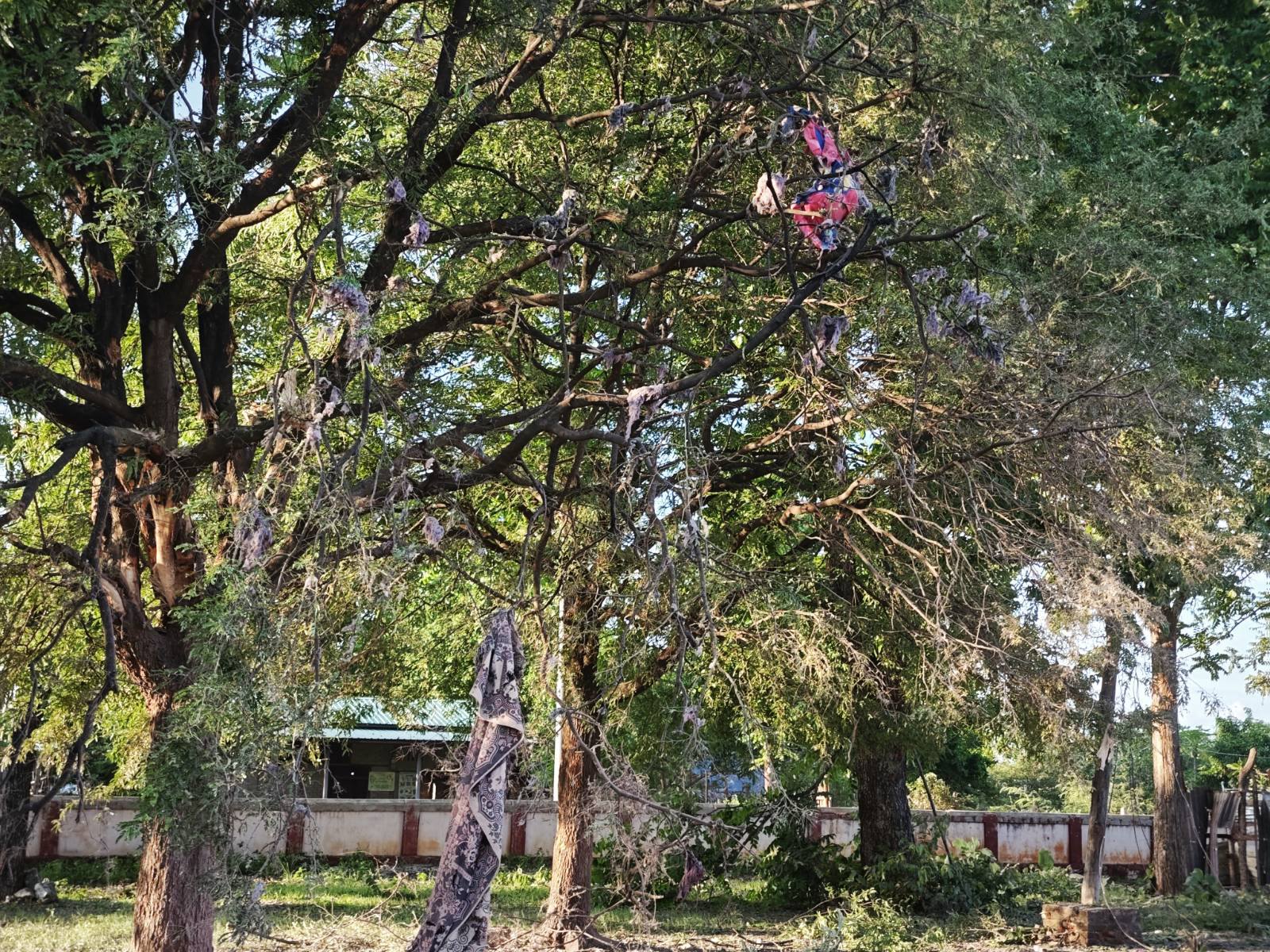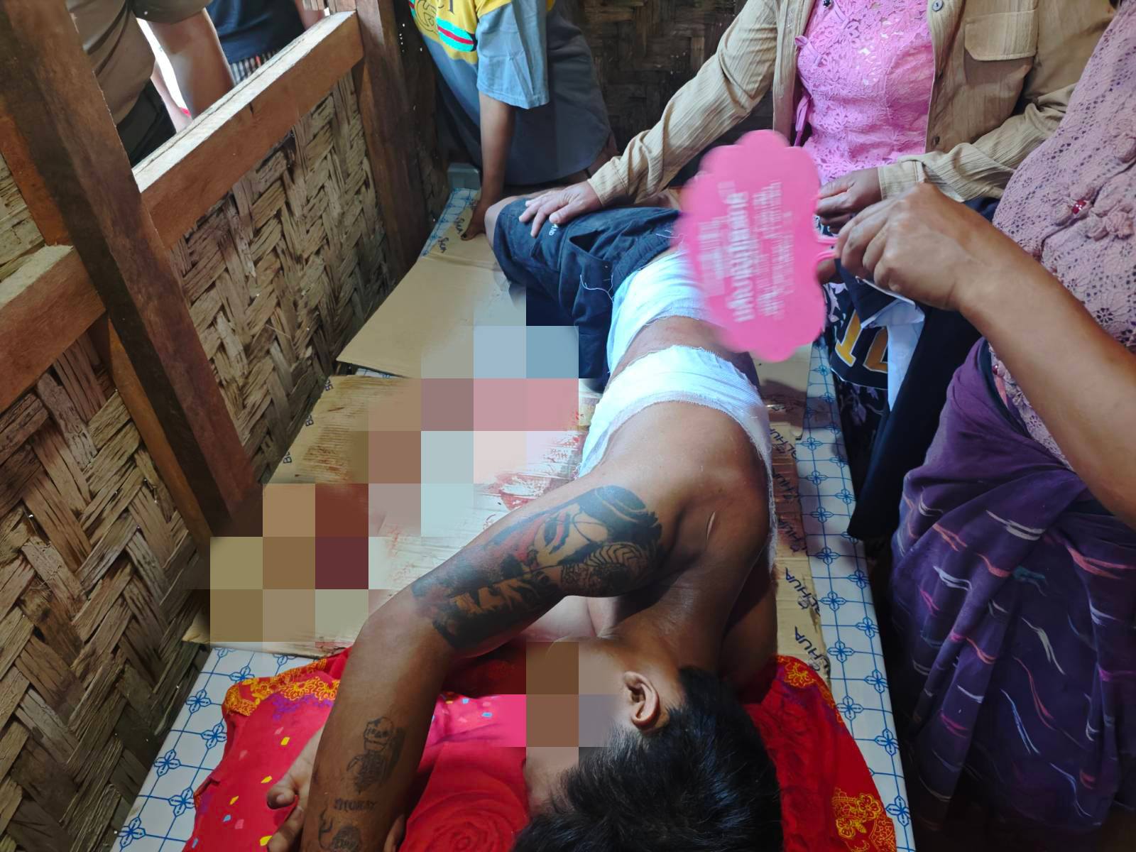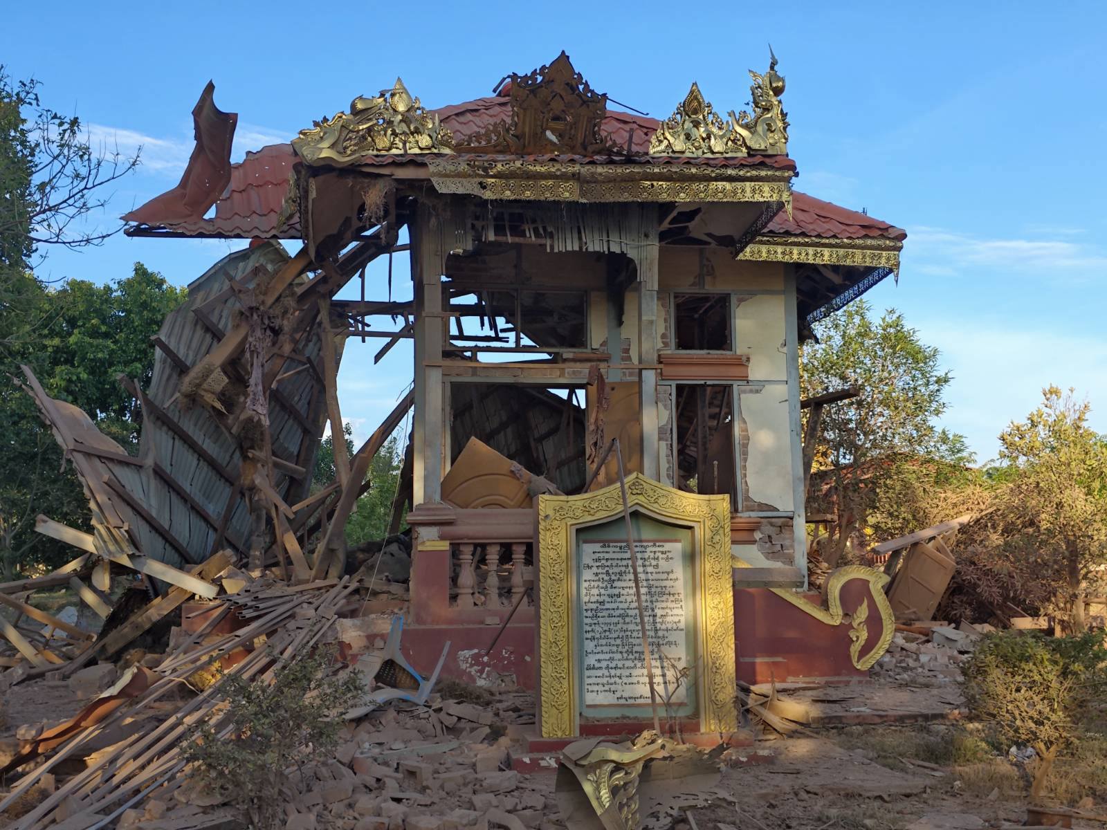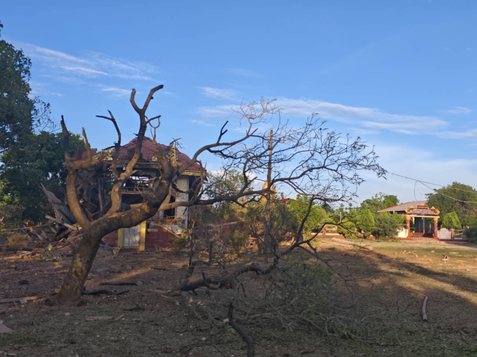 လေကြောင်းတိုက်ခိုက်ခံရပြီးနောက် မြင်တွေ့ရသည့် ကြက်ရိုးပင်ရွာ ဘုန်းတော်ကြီးကျောင်းနှင့် ထိခိုက််ဒဏ်ရာရသူများ (ဓာတ်ပုံ ပြည်သူ့ကာကွယ်ရေးအဖွဲ့ ပြင်ဦးလွင်ခရိုင်)