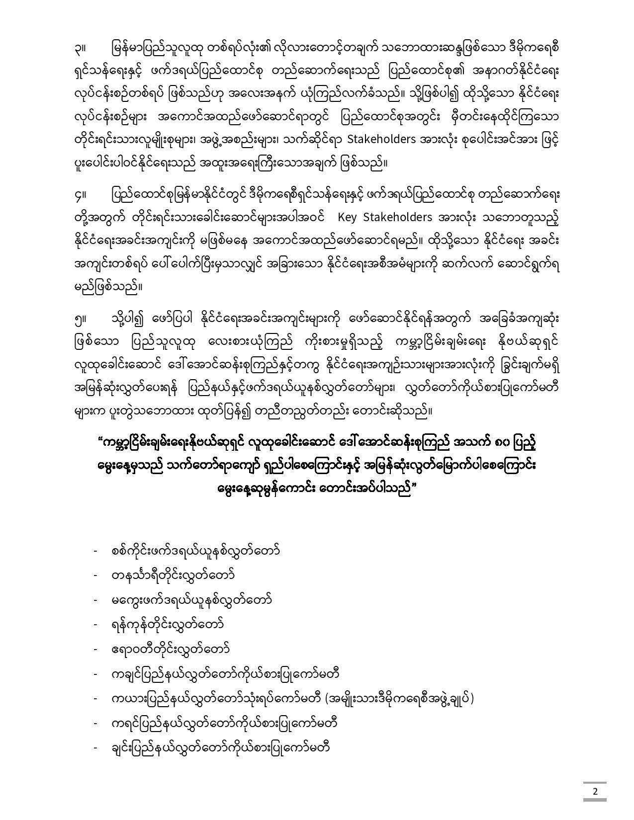 ဒီမိုကရေစီရှင်သန်ရေးနဲ့ ဖက်ဒရယ်ပြည်ထောင်စု တည်ဆောက်ရေးတို့အတွက် တိုင်းရင်းသားခေါင်းဆောင်တွေအပါအဝင် Key Stakeholders အားလုံး သဘောတူတဲ့ နိုင်ငံရေးအခင်းအကျင်းကို မဖြစ်မနေ အကောင်အထည်ဖော်ဆောင်ရမှာဖြစ်ပြီး အဲဒီ နိုင်ငံရေး အခင်းအကျင်းတစ်ရပ် ပေါ်ပေါက်ပြီးမှသာ အခြား နိုင်ငံရေးအစီအမံတွေကို ဆက်လက် ဆောင်ရွက်ရမယ်လို့ ထုတ်ပြန်ထားပါတယ်။