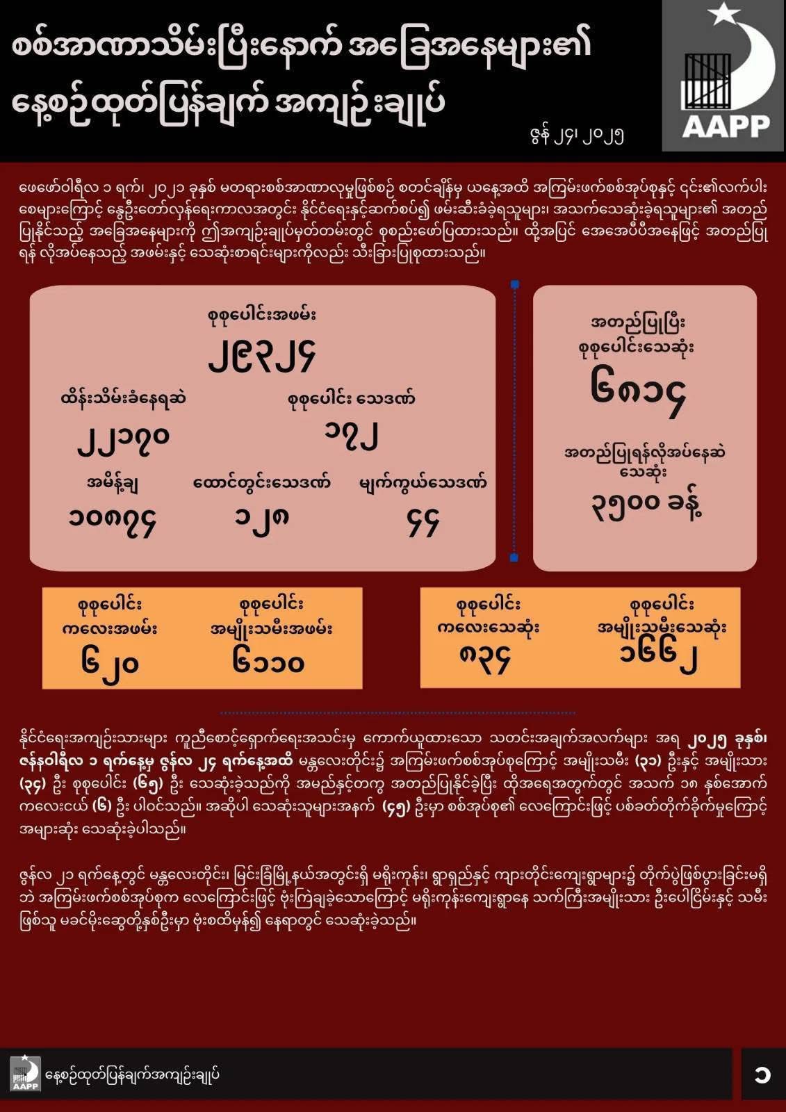 ၂၀၂၁ ခုနှစ် ဖေဖော်ဝါရီလ ၁ ရက် မတရားစစ်အာဏာလုချိန်ကစလို့ ဇွန်လ ၂၄ ရက် ဒီနေ့အထိ နွေဦးတော်လှန်ရေးကာလအတွင်း အကြမ်းဖက်စစ်အုပ်စုနဲ့ လက်ပါးစေတွေကြောင့် သေဆုံးခဲ့ရတဲ့ ဒီမိုကရေစီရေး လှုပ်ရှားသူတွေနဲ့ အရပ်သားပြည်သူစုစုပေါင်း (၆၈၁၄) ယောက် ရှိခဲ့ပြီဖြစ်တယ်လို့ AAPP က ထုတ်ပြန်ထားပါတယ်။