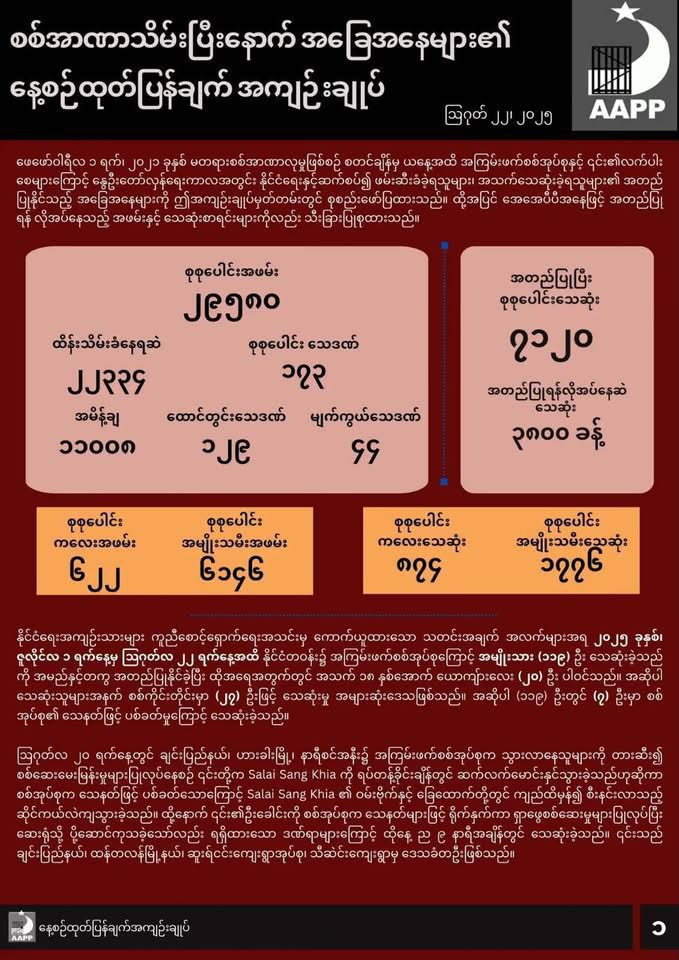 ဇူလိုင်လ ၁ ရက်ကနေ ဩဂုတ်လ ၂၂ ရက်အထိ နိုင်ငံတဝန်း အကြမ်းဖက်စစ်အုပ်စုကြောင့် အမျိုးသား (၁၁၉) ယောက် သေဆုံးခဲ့တာကို နာမည်နဲ့တကွ အတည်ပြုနိုင်ခဲ့တယ်လို့ AAPP က ဆိုပါတယ်။