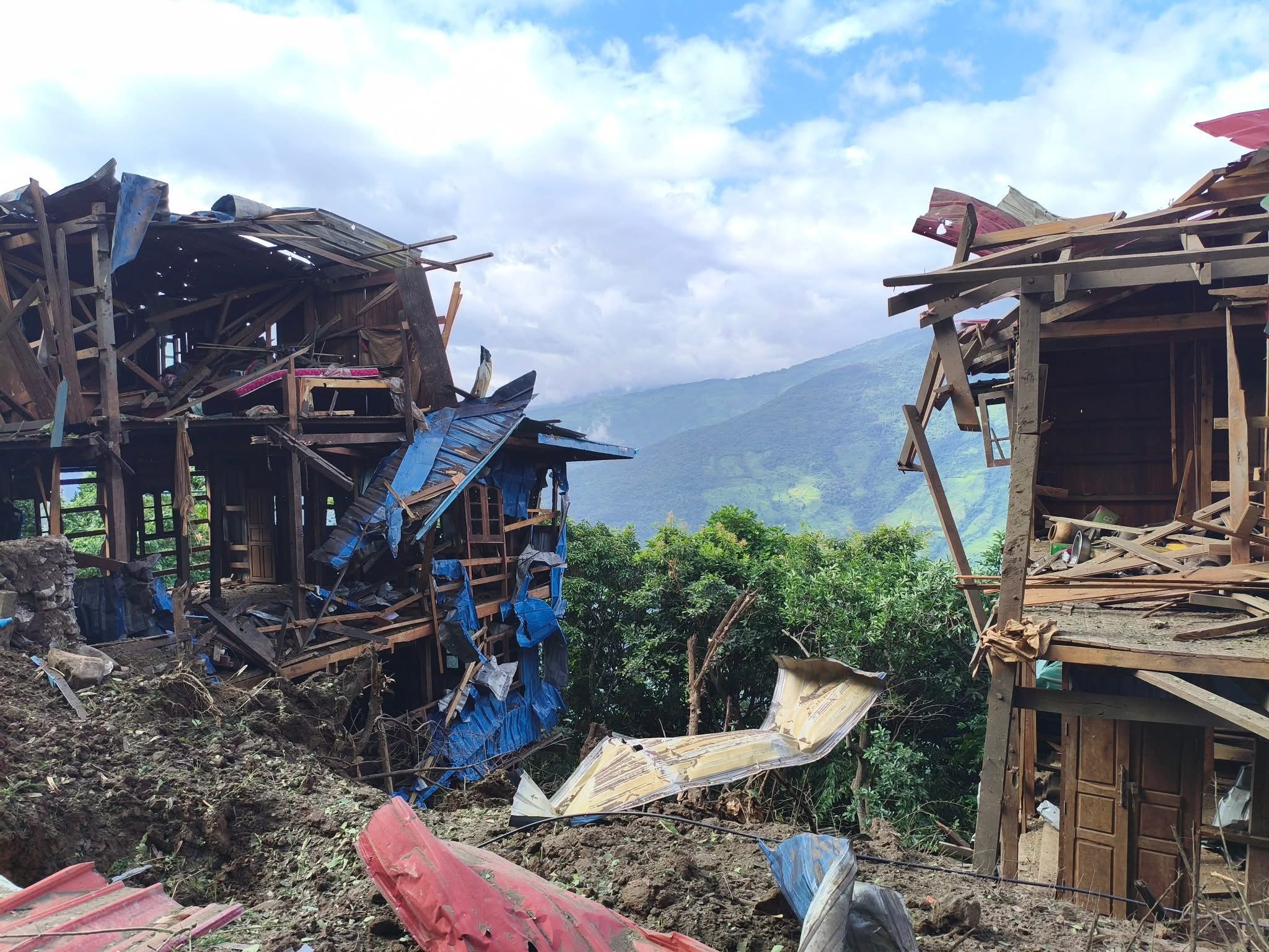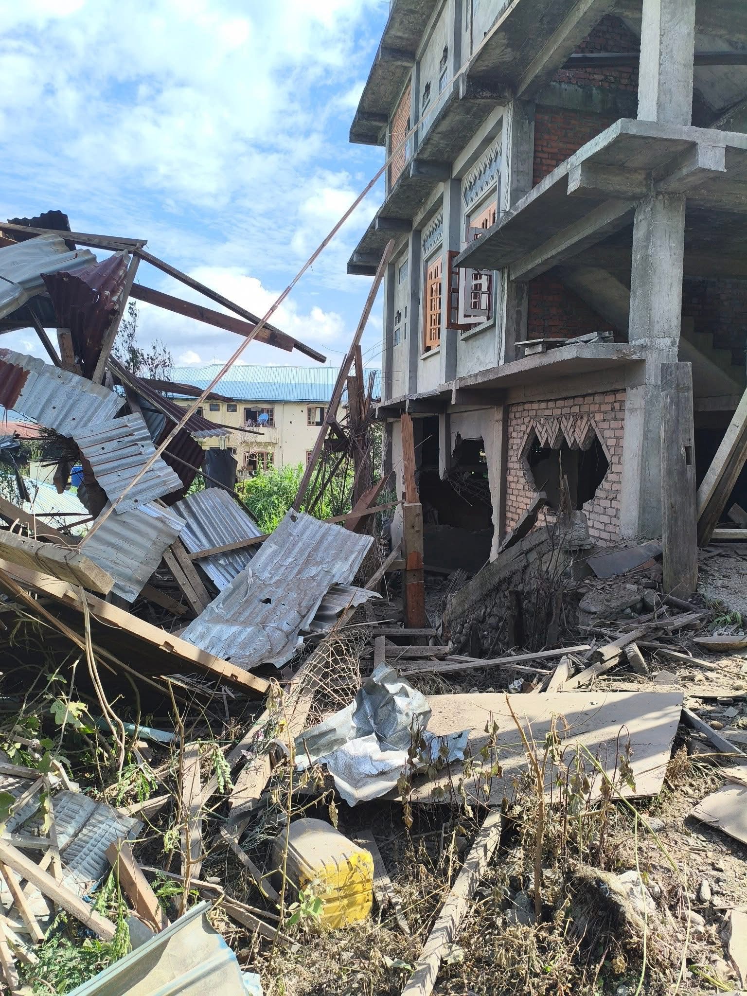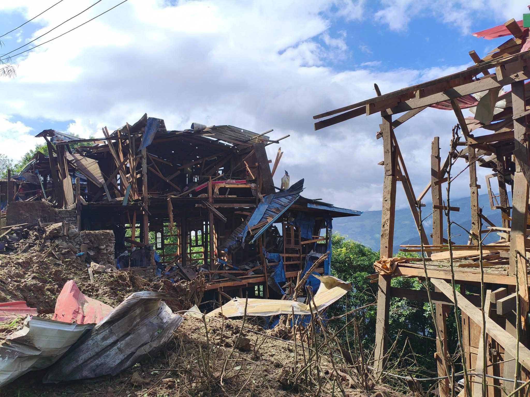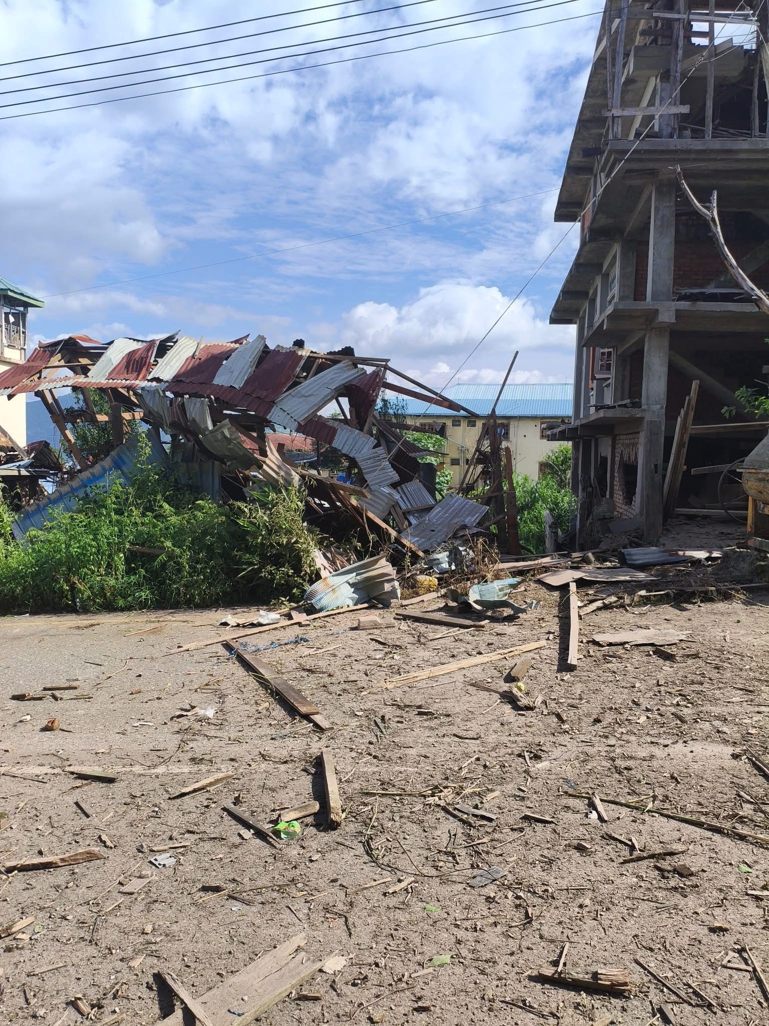 ဩဂုတ်လ ၃ ရက်က မင်းတပ်မြို့ကို အကြမ်းဖက်စစ်တပ် လေကြောင်းတိုက်ခိုက်မှုကြောင့် ပျက်စီးသွားသည့် နေအိမ်များ (ဓာတ်ပုံ မင်းတပ် မြို့နယ်ပြည်သူ့အုပ်ချုပ်ရေးအဖွဲ့)