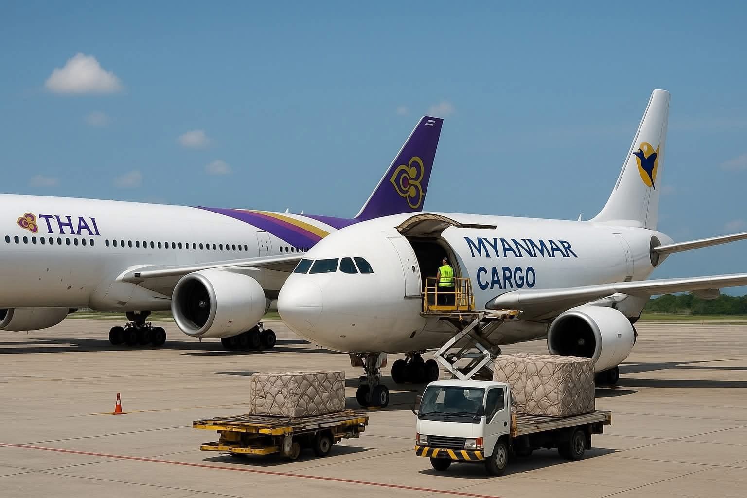 Air Cargo နဲ့ ကုန်ပစ္စည်းတင်ပို့မှု ကန့်သတ်တာကို အာဏာသိမ်းစစ်တပ်က သြဂုတ် ၂၃ ရက်ကစလို့ စီမံချက်နဲ့ စတင်လုပ်ဆောင်နေပြီး ထိုင်းကုန်ပစ္စည်းတွေကို တရားမဝင် တင်သွင်းတယ်ဆိုတဲ့ အကြောင်းပြချက်နဲ့ ပိတ်ဆို့ဖမ်းဆီးနေတာကြောင့် ကုန်သည်အများစုက ထိုင်းကုန်ပစ္စည်း တင်သွင်းမှု ရပ်နားထားသလို ရပ်နားချိန် ကြာလာတာနဲ့အမျှ ထိုင်းကုန်ပစ္စည်း ပြတ်လပ်မှုတွေ ဖြစ်ပေါ်လာနိုင်တယ်လို့ ဆိုပါတယ်။