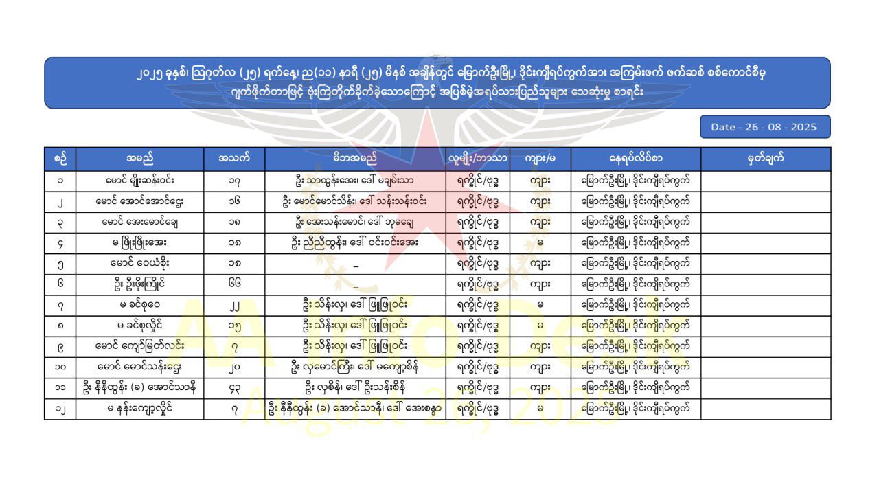 အနီးကပ်ဆုံး ဖြစ်စဥ်အနေနဲ့ မနေ့က သြဂုတ်လ ၂၅ရက် ည ၁၁နာရီ ၂၅ မိနစ်အချိန်မှာ ရခိုင်ပြည်နယ် မြောက်ဦးမြို့၊ ဒိုင်းကျီရပ်ကွက်ကို အကြမ်းဖက်စစ်တပ်က ဂျက်ဖိုက်တာနဲ့ ဗုံး ၂လုံး ကြဲချတိုက်ခိုက်ခဲ့တာ ဖြစ်ပါတယ်။