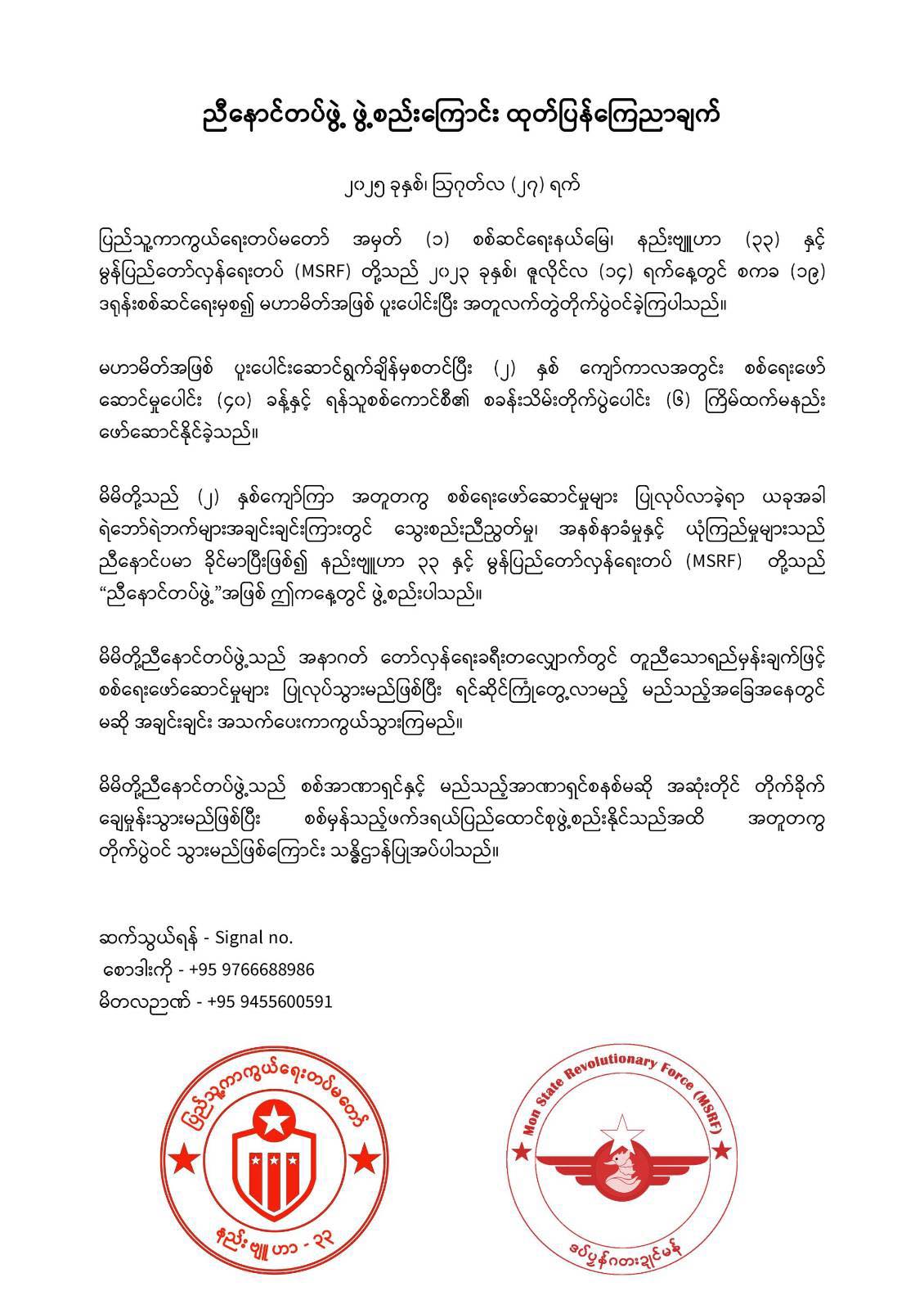 ညီနောင်တပ်ဖွဲ့ဟာ အနာဂတ်တော်လှန်ရေးခရီးတလျှောက်မှာ တူညီတဲ့ ရည်မှန်းချက်တွေနဲ့ စစ်ရေးဖော်ဆောင်မှုတွေ လုပ်ဆောင်သွားမှာဖြစ်ပြီး ရင်ဆိုင်ကြုံတွေ့လာရမယ့် ဘယ်အခြေအနေမျိုးမှာမဆို အသက်ပေး ကာကွယ်သွားဖို့ အချင်းချင်း သဘောတူညီချက်တွေ ထားရှိထားတယ်လို့ သိရပါတယ်။
