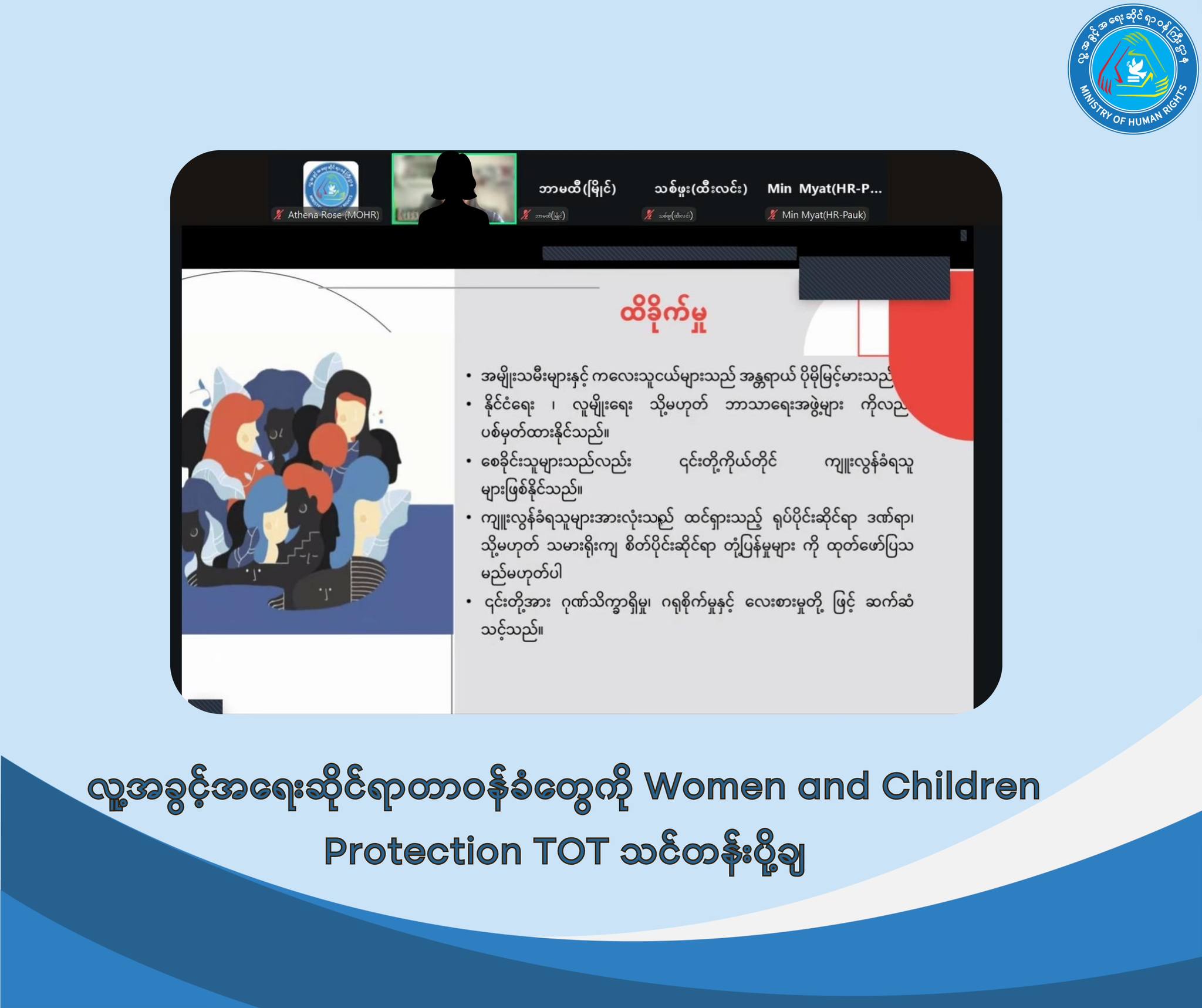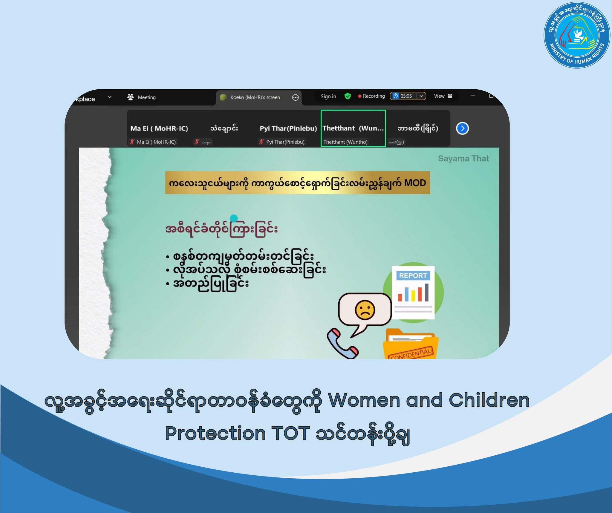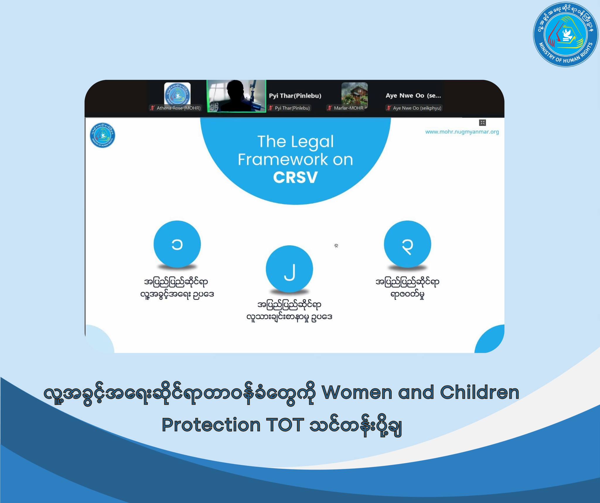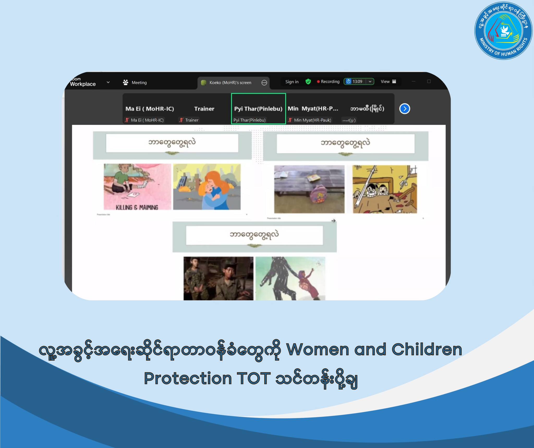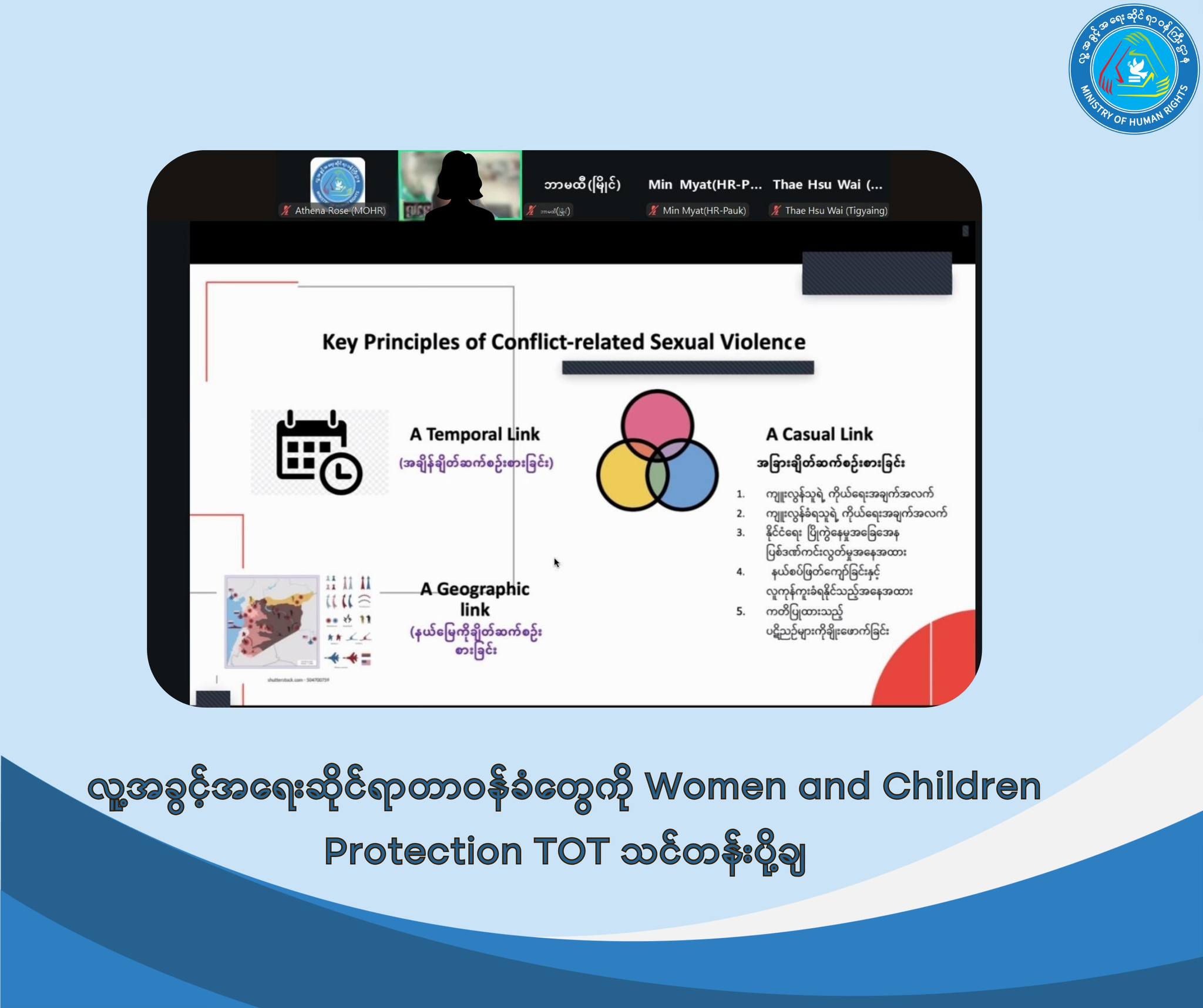 ၅ ရက်ကြာပြုလုပ်တဲ့ အဆိုပါသင်တန်းမှာ ကလေးသူငယ်အခွင့်အရေး၊ ကလေးငယ်တွေရဲ့ ကာကွယ်စောင့်ရှောက်မှုခံယူပိုင်ခွင့်၊ ဂျန်ဒါအခြေပြု အကြမ်းဖက်မှု၊ ကလေးတွေအပေါ် ကြီးလေးတဲ့ချိုးဖောက်မှုတွေ (6 Graves Violations)၊ အမျိုးသမီးတွေအပေါ် လိင်ပိုင်းဆိုင်ရာအကြမ်းဖက်မှုနဲ့ ပဋိပက္ခဆက်စပ်လိင်အကြမ်းဖက်မှု (CRSV) အပါအဝင် အမျိုးသမီးနဲ့ကလေးငယ်တွေနဲ့ ပတ်သက်ပြီး အခြေခံသိသင့်တဲ့ အခွင့်အရေးတွေကို သက်ဆိုင်ရာ သင်တန်းနည်းပြတွေက မျှဝေပို့ချခဲ့တယ်လို့ သိရပါတယ်။
