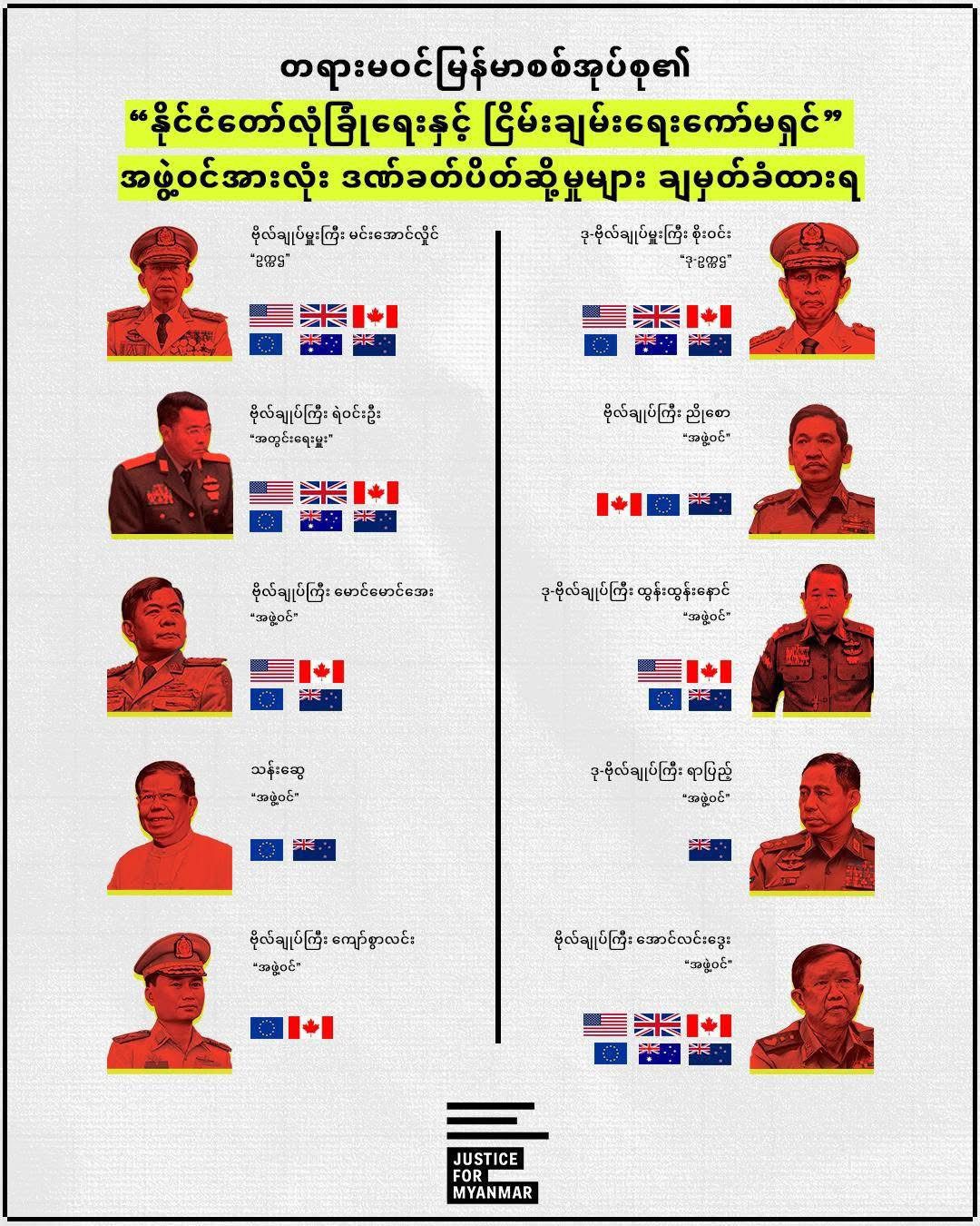ယခင် စစ်ကောင်စီ SAC အဖွဲ့ကို ၂၀၂၁ ခုနှစ် မေလ ၁၇ရက်မှာ အမေရိကန်ပြည်ထောင်စုကလည်းကောင်း၊ ၂၀၂၁ ခုနှစ် ဇွန်လ ၂၁ရက်မှာ ယူကေနိုင်ငံကလည်းကောင်း၊ ၂၀၂၂ ခုနှစ် နိုဝင်ဘာ ၈ရက်နေ့မှာ အီးယူကလည်းကောင်း၊ ၂၀၂၃ ခုနှစ် အောက်တိုဘာ ၃၁ ရက်မှာ ကနေဒါနိုင်ငံကလည်းကောင်း ဒဏ်ခတ်ပိတ်ဆို့မှုတွေ အသီးသီး ချမှတ်ခဲ့တာ ဖြစ်ပါတယ်။