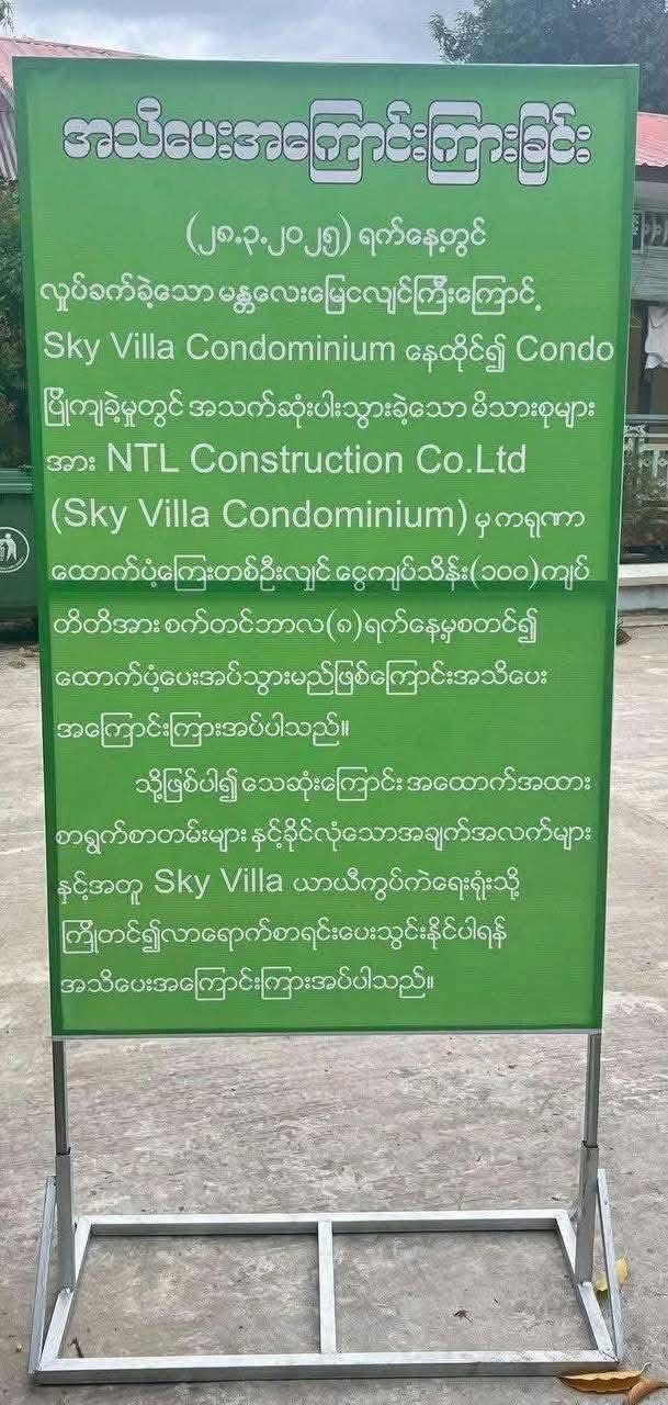 မန္တလေးတိုင်း အောင်မြေသာစံမြို့နယ်မှာရှိတဲ့ Sky Villa ကွန်ဒိုကို NTL ကုမ္ပဏီက တည်ဆောက်ရောင်းချခဲ့တာဖြစ်ပြီး သေဆုံးကြောင်း အထောက်အထား စာရွက်စာတမ်းတွေ၊ ခိုင်လုံတဲ့အချက်အလက်တွေနဲ့အတူ Sky Villa ယာယီကွပ်ကဲရေးရုံးကို လာရောက်စာရင်းသွင်းဖို့ ကြေညာထားပါတယ်။