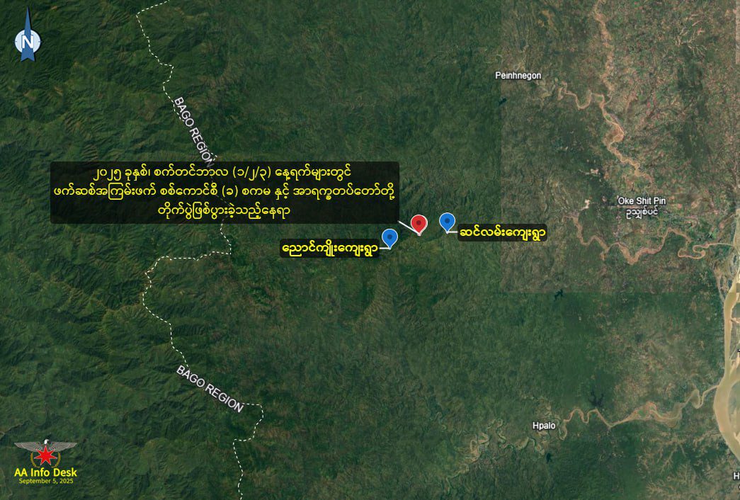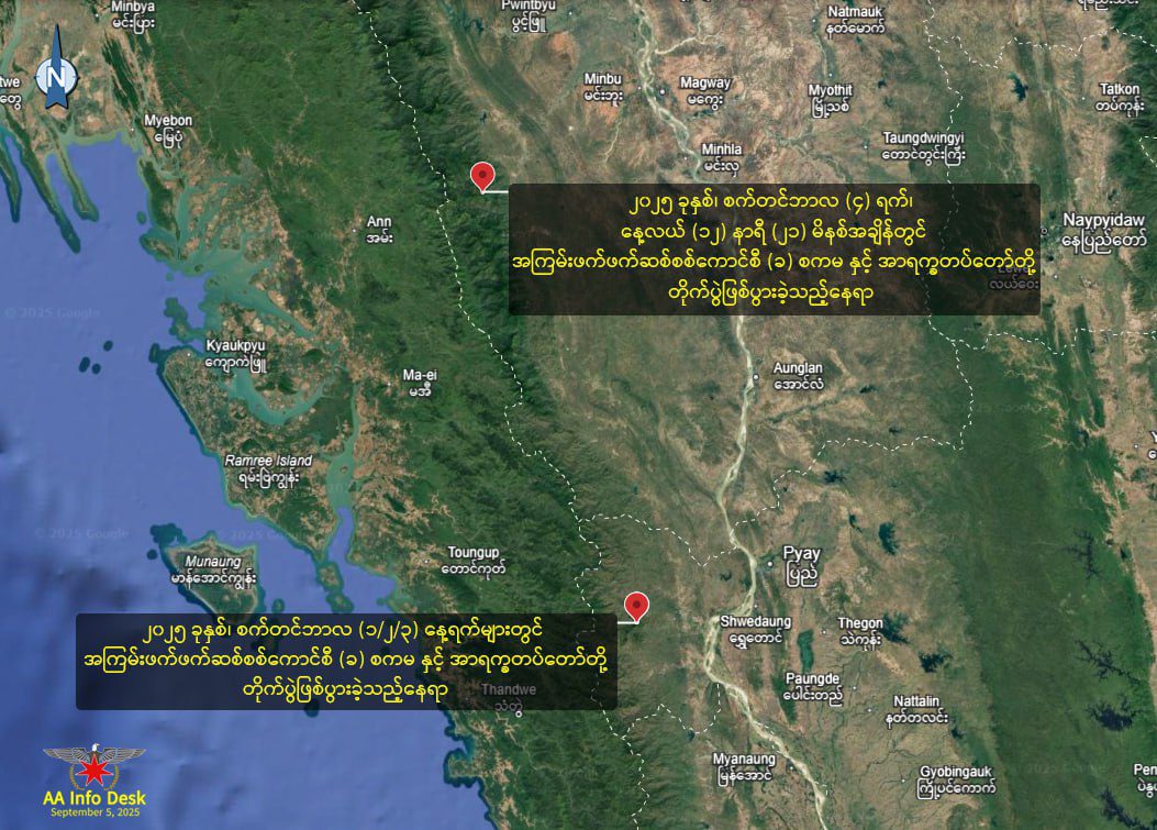 ဖက်ဆစ်အကြမ်းဖက်စစ်တပ်နဲ့ အာရက္ခတပ်တော်တို့ လက်ရှိရင်ဆိုင်ထားတဲ့ နေရာတွေထဲက ပဲခူးတိုင်း၊ ပန်းတောင်မြို့နယ်၊ ဆင်လမ်ကျေးရွာအနောက်ဘက် (၂) ကီလိုမီတာနဲ့ (၁.၇) ကီလိုမီတာ အကွာအဝေးနေရာ၊ ပဲခူးတိုင်း၊ ပန်းတောင်မြို့နယ်၊ ညောင်ကျိုးကျေးရွာရဲ့ အရှေ့ မြောက်ဘက် (၂.၅) ကီလိုမီတာအကွာအဝေး တောင်ကြော၊ ဧရာဝတီတိုင်း-ရက္ခိုင်အစပ် စက်စက်ယိုရွာ ပတ်ဝန်းကျင်တွေမှာ စစ်အုပ်စုက နေ့တိုင်း ထိုးစစ်ဆင် တိုက်ခိုက်နေတာကြောင့် တိုက်ပွဲနဲ့ ဆက်စပ်နေတဲ့ အခြားနေရာတွေမှာပါ တိုက်ပွဲတွေ ပြင်းထန်နေတယ်လို့ AA က ဆိုပါတယ်။