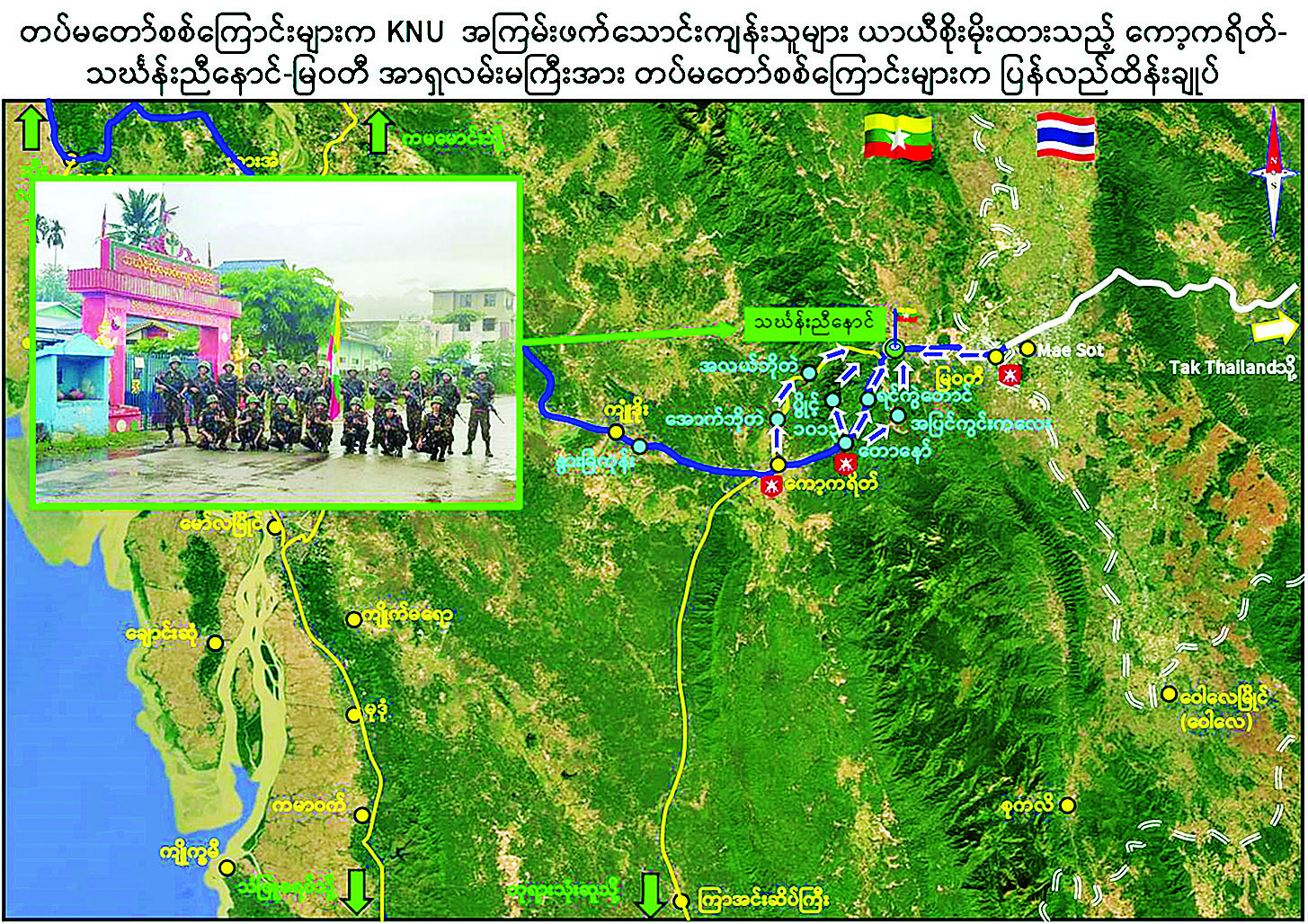 ကော့ကရိတ်-မြဝတီ အာရှလမ်းပိုင်းကို ပြန်လည်ထိန်းချုပ်နိုင်ဖို့နဲ့ ရွေးကောက်ပွဲ ကျင်းပနိုင်ဖို့ရာအတွက် အကြမ်းဖက်စစ်ကော်မရှင်က အောင်ဇေယျ စစ်ကြောင်း ၂ ကြောင်းနဲ့ တိုက်ခိုက်ခဲ့တာဖြစ်တယ်လို့လည်း ရှေ့တန်းသတင်းရင်းမြစ်တွေဆီက သိရပါတယ်။