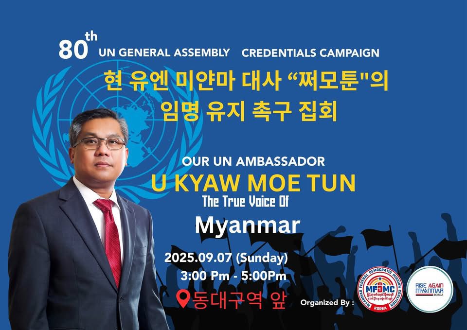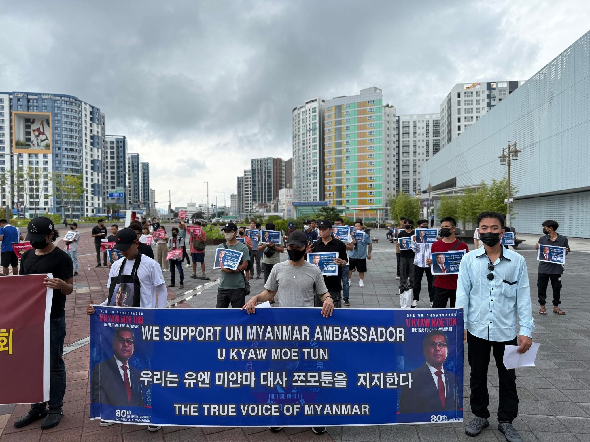 တောင်ကိုးရီးယားနိုင်ငံ၊ ဒယ်ဂူးမြို့မှာ သံအမတ်ကြီး ဦးကျော်မိုးထွန်း ကုလသမဂ္ဂမှာ ဆက်ရှိစေရေးအတွက် ထောက်ခံဆန္ဒပြပွဲကို ကျင်းပပြုလုပ်ခဲ့တယ်လို့ တောင်ကိုးရီးယားနိုင်ငံ တော်လှန်ပြည်သူတွေထံက သိရပါတယ်။