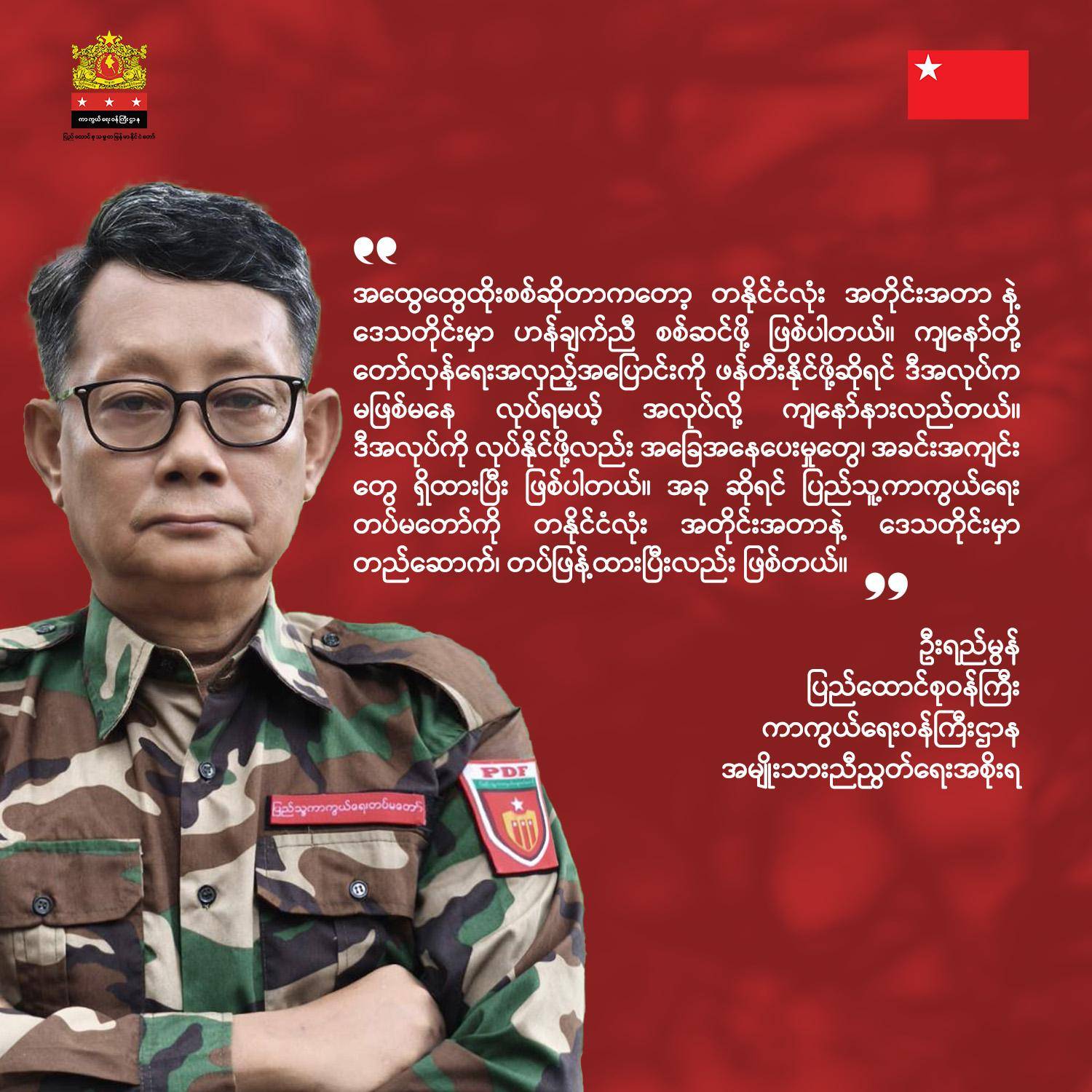 “အထွေထွေထိုးစစ်ဆိုတာကတော့ တနိုင်ငံလုံး အတိုင်းအတာနဲ့ ဒေသတိုင်းမှာ ဟန်ချက်ညီ စစ်ဆင်ဖို့ဖြစ်ပါတယ်။ ကျနော်တို့ တော်လှန်ရေးအလှည့်အပြောင်းကို ဖန်တီးနိုင်ဖို့ဆိုရင် ဒီအလုပ်က မဖြစ်မနေ လုပ်ရမယ့်အလုပ်လို့ ကျနော် နားလည်တယ်။ ဒီအလုပ်ကိုလုပ်နိုင်ဖို့လဲ အခြေအနေပေးမှုတွေ၊ အခင်းအကျင်းတွေ ရှိထားပြီး ဖြစ်ပါတယ်။ အခုဆိုရင် ပြည်သူ့ကာကွယ်ရေးတပ်မတော်ကို တနိုင်ငံလုံးအတိုင်းအတာနဲ့ ဒေသတိုင်းမှာ တည်ဆောက်၊ တပ်ဖြန့်ထားပြီးလည်း ဖြစ်တယ်” လို့ NUG ကာကွယ်ရေးဝန်ကြီး ဦးရည်မွန်က ပြောပါတယ်။