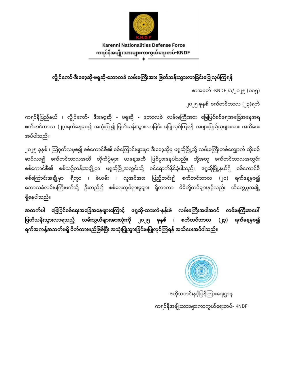 ကရင်နီပြည်နယ် ၊ လွိုင်ကော်- ဒီးမော့ဆို – ဖရူဆို – ဘောလခဲ လမ်းမကြီးကို မြေပြင်စစ်ရေးအခြေအနေအရ စက်တင်ဘာလ (၂၃) ရက်ကစလို့ ဖြတ်သန်းသွားလာခြင်း မပြုလုပ်ဖို့ အများပြည်သူကို အသိပေးကြောင်း KNDF က ဒီနေ့ ထုတ်ပြန်ပါတယ်။