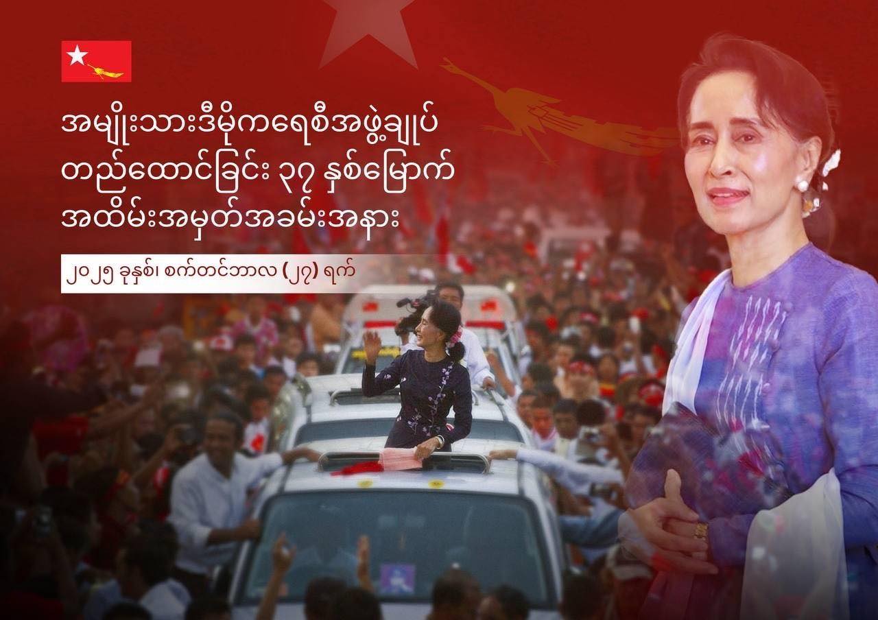 အမျိုးသားဒီမိုကရေစီအဖွဲ့ချုပ် (NLD) ပါတီ တည်ထောင်ခြင်း ၃၇ နှစ်မြောက် အခမ်းအနားကို ‘နိုင်ငံရေးအကျဉ်းသားများအားလုံး လွတ်မြောက်ရေး” ဆိုတဲ့ နိုင်ငံရေးရည်မှန်းချက်ထားပြီး ကျင်းပသွားမယ်လို့ ဒီနေ့မှာ ထုတ်ပြန်ထားပါတယ်။