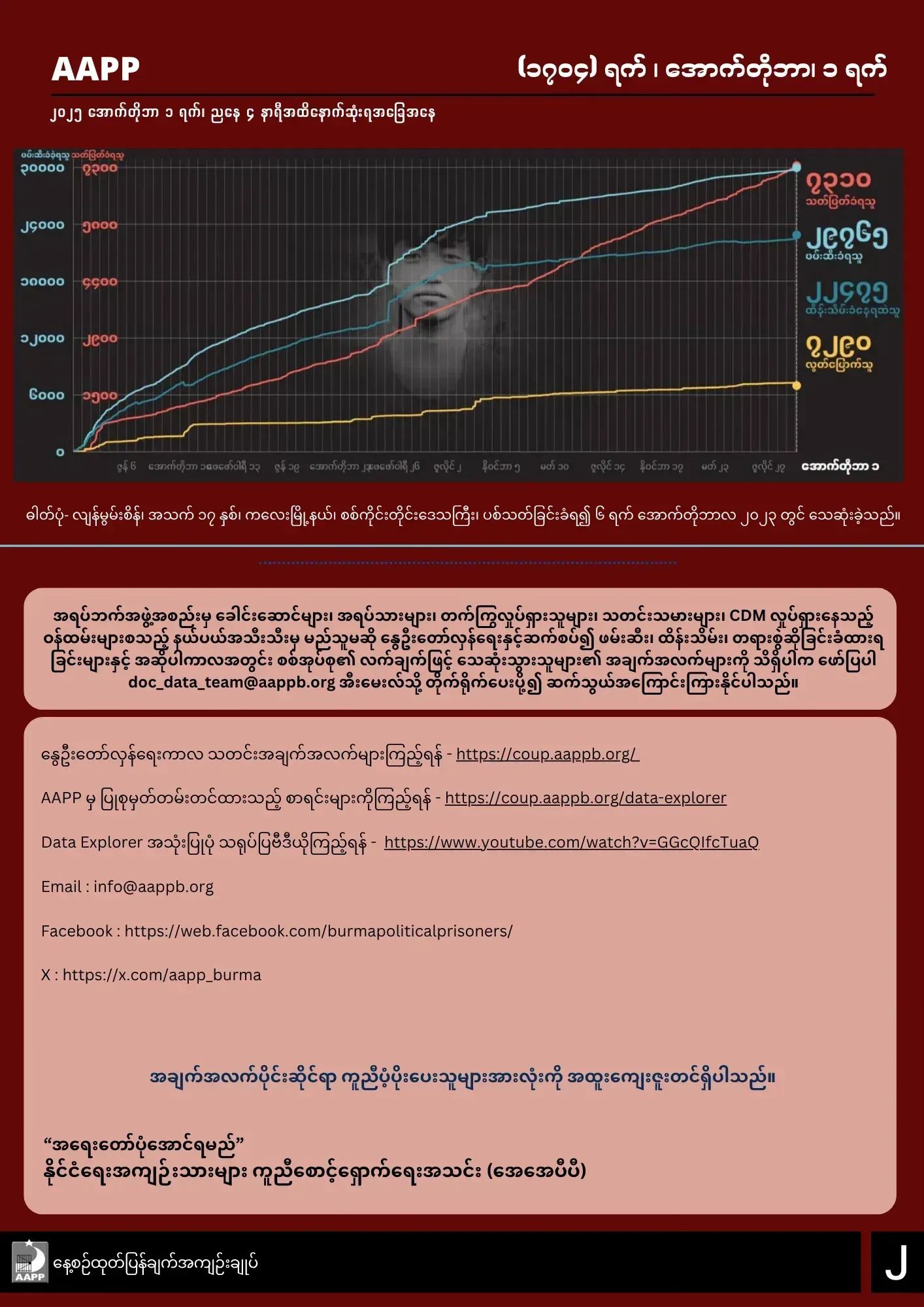 အကြမ်းဖက်စစ်အုပ်စုက မတရားအာဏာလုယူခဲ့တဲ့ ၂၀၂၁ ခုနှစ် ဖေဖော်ဝါရီ ၁ ရက် ကနေ ၂၀၂၅ ခုနှစ် အောက်တိုဘာ ၁ ရက်အထိ အကြမ်းဖက်စစ်အုပ်စုနဲ့ လက်ပါးစေတွေကြောင့် သေဆုံးရသူ ဒီမိုကရေစီအရေး လှုပ်ရှားသူနဲ့ ပြည်သူစုစုပေါင်း ၇၃၁၀ ယောက်အထိ ရှိပြီဖြစ်တယ်လို့ AAPP က ထုတ်ပြန်ထားပါတယ်။