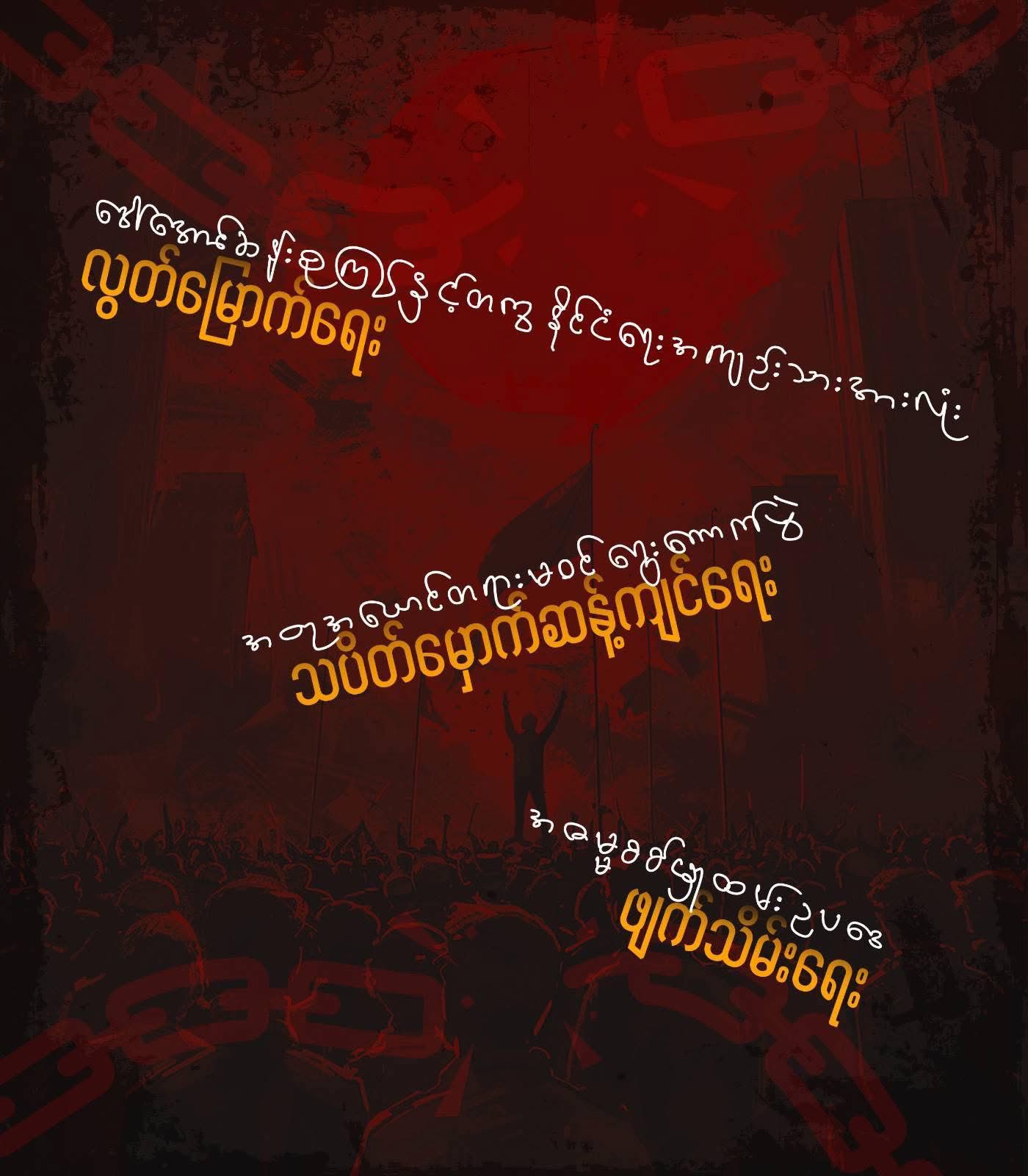 တရုတ်နိုင်ငံရဲ့ စပွန်ဆာနဲ့ ပြုလုပ်မယ့် အကြမ်းဖက်စစ်အုပ်စုရဲ့ ရွေးကောက်ပွဲအတုကို လူထုအားနဲ့ တိုက်ဖျက်ဖို့အတွက် လူထုတိုက်ပွဲရဲ့ အဓိကဦးတည်လှုပ်ရှားမှု ၃ ရပ်ကို အထွေထွေသပိတ် ပေါင်းစပ်ညှိနှိုင်းရေး အင်အားစု (General Strike Coordination Body – GSCB) က ထုတ်ပြန်ထားပါတယ်။
