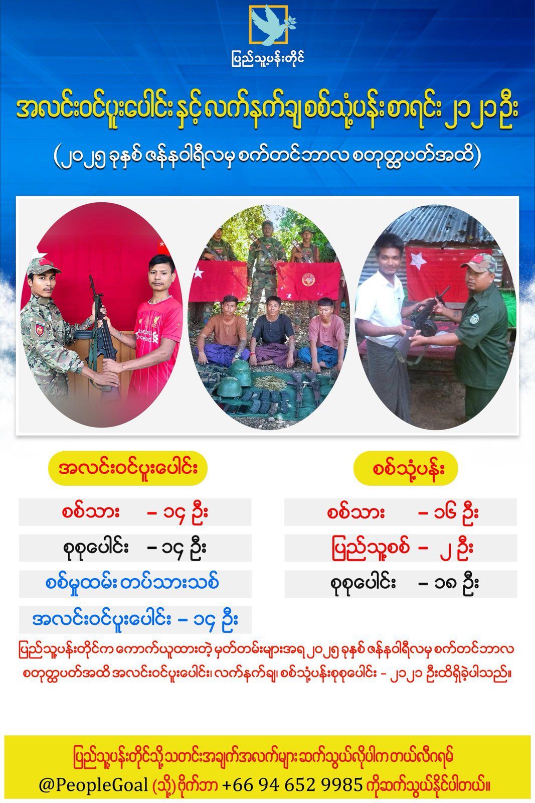 စက်တင်ဘာလ စတုတ္ထပတ်အတွင်းမှာလည်း အကြမ်းဖက်စစ်တပ်ကနေ စစ်မှုထမ်းတပ်သားသစ် ၁၄ ယောက် အလင်းဝင်လာပြီး စစ်သုံ့ပန်းအဖြစ် ဖမ်းဆီးရမိသူ ၁၈ ယောက် ရှိတယ်လို့လည်း ပြည်သူ့ပန်းတိုင်ရဲ့ ထုတ်ပြန်ချက်မှာ ဖော်ပြထားပါတယ်။