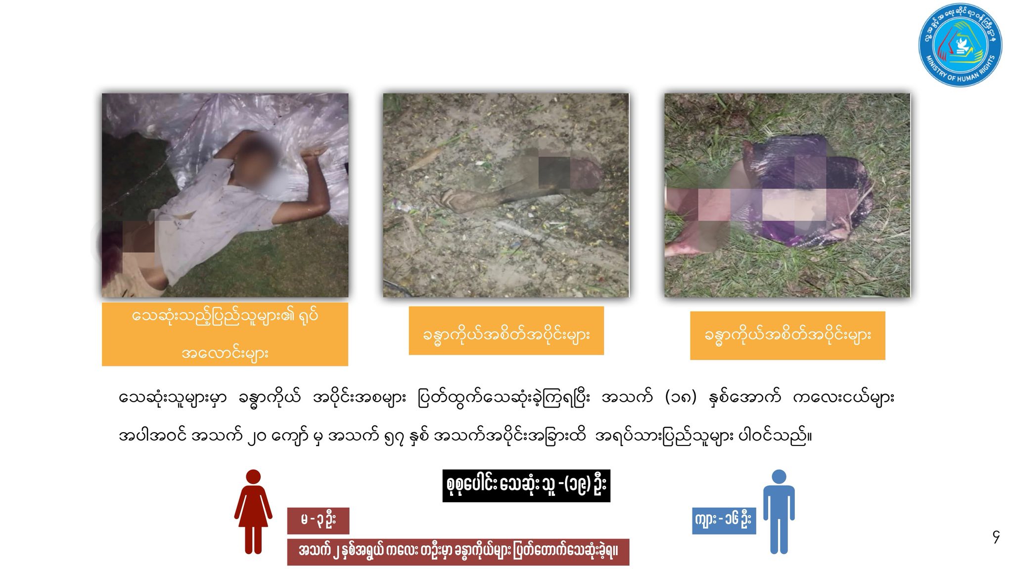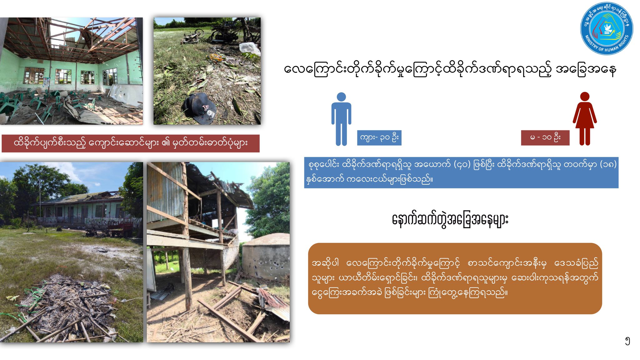 ဒါ့အပြင် အသက် (၁၈) နှစ်အောက် ကလေးငယ် အယောက် ၂၀၊ အမျိုးသား ၁၃ ယောက်နဲ့ အမျိုးသမီး ၇ ယောက် စုစုပေါင်း အရပ်သားပြည်သူ အယောက် ၄၀ ပြင်းထန်တဲ့ ထိခိုက်ဒဏ်ရာရရှိခဲ့တယ်လို့ သိရပါတယ်။