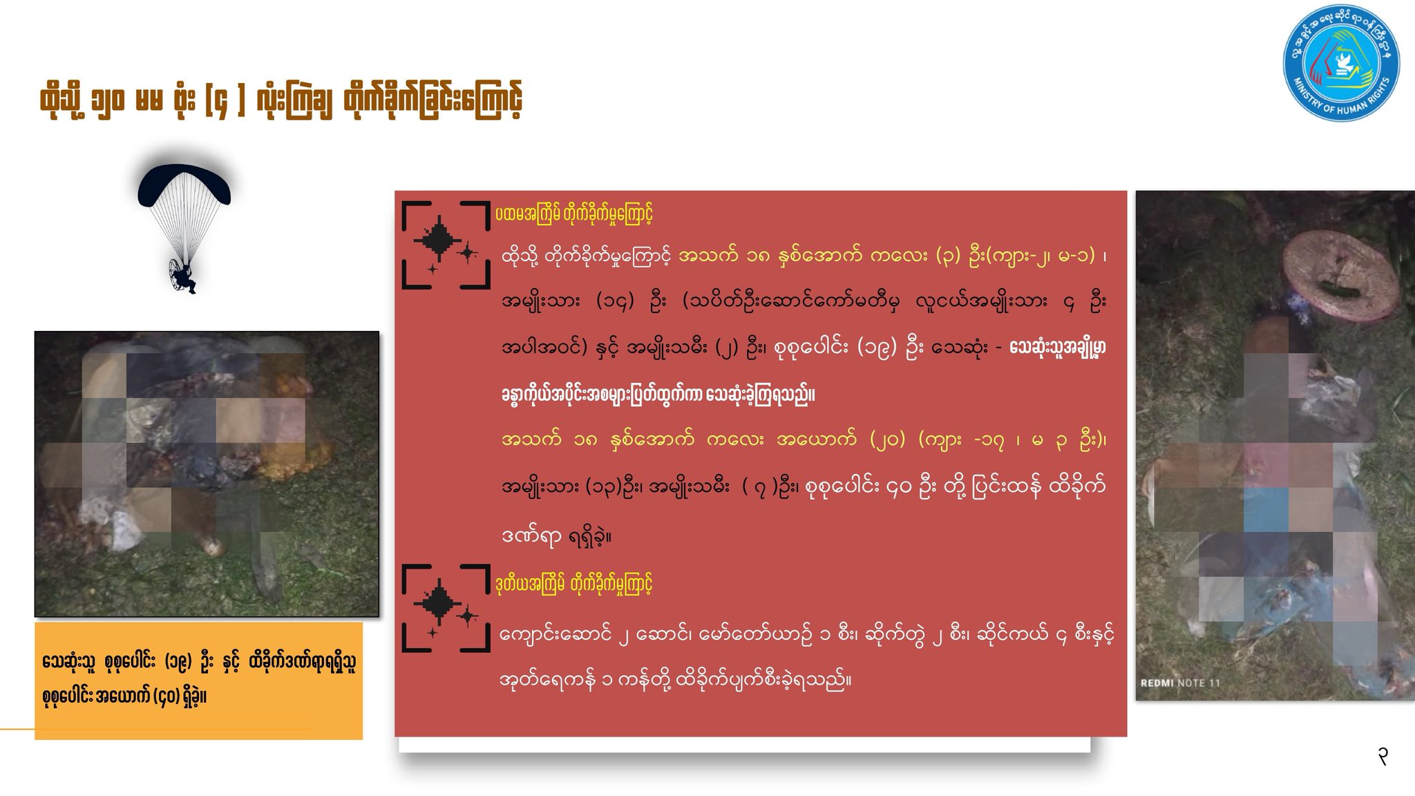 အနောက်မြောက်တိုင်းစစ်ဌာနချုပ် (နမခ)ကနေ လာတဲ့ အကြမ်းဖက်စစ်အုပ်စုရဲ့ Paramotor နဲ့ ၁၂၀ မမ ဗုံးသီး ၂ လုံး ကြဲချတိုက်ခိုက်ခဲ့တာဖြစ်ပြီး တိုက်ခိုက်မှုကြောင့် ထိခိုက်ဒဏ်ရာရသူတွေကို ဆေးကုသနေတဲ့ ည ၁၁ နာရီ အချိန်မှာလည်း အကြမ်းဖက်စစ်အုပ်စုက ထပ်မံပြီး Paramotor ၂ စီးနဲ့ ၁၂၀ မမ ဗုံးသီး ၂ လုံး စာသင်ကျောင်းပေါ် တည့်တည့်ကို ထပ်မံကြဲချတိုက်ခိုက်ခဲ့တယ်လို့ သိရပါတယ်။