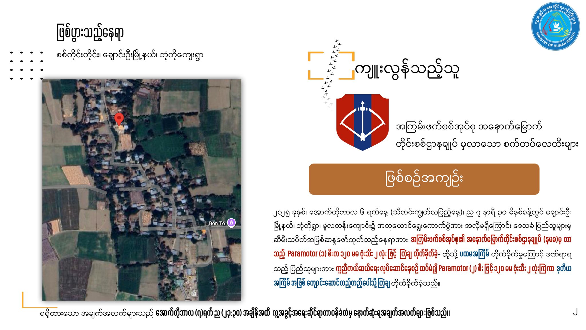 စစ်ကိုင်းတိုင်း၊ ချောင်းဦးမြို့နယ်၊ ဘုံတိုရွာမှာရှိတဲ့ မူလတန်းကျောင်းကို အောက်တိုဘာ ၆ ရက် သီတင်းကျွတ်လပြည့်နေ့မှာ အကြမ်းဖက်စစ်အုပ်စုက ဗုံးကြဲတိုက်ခိုက်ခဲ့မှုကြောင့် ကလေးငယ်တွေအပါအဝင် အရပ်သားပြည်သူ ၁၉ ယောက် သေဆုံးခဲ့ပြီး အယောက် ၄၀ ပြင်းထန်ဒဏ်ရာတွေ ရရှိခဲ့တယ်လို့ အမျိုးသားညီညွတ်ရေးအစိုးရ၊ လူ့အခွင့်အရေးဆိုင်ရာဝန်ကြီးဌာနက ဒီနေ့ တရားဝင် ထုတ်ပြန်ပါတယ်။